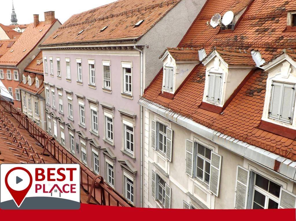 2 große Räume bieten Singles oder Päarchen genügend Raum. Ein Bad mit Dusche und Waschbecken und ein separates WC sind vorhanden. Ebenso eine kleine Teeküche.und ein Abstellraum. Der Ausblick auf die Dächer der Stempfergasse lohnt den Aufstieg in den 4. Stock! Ungestörtes Wohnen mit Innenstadt-Flair.