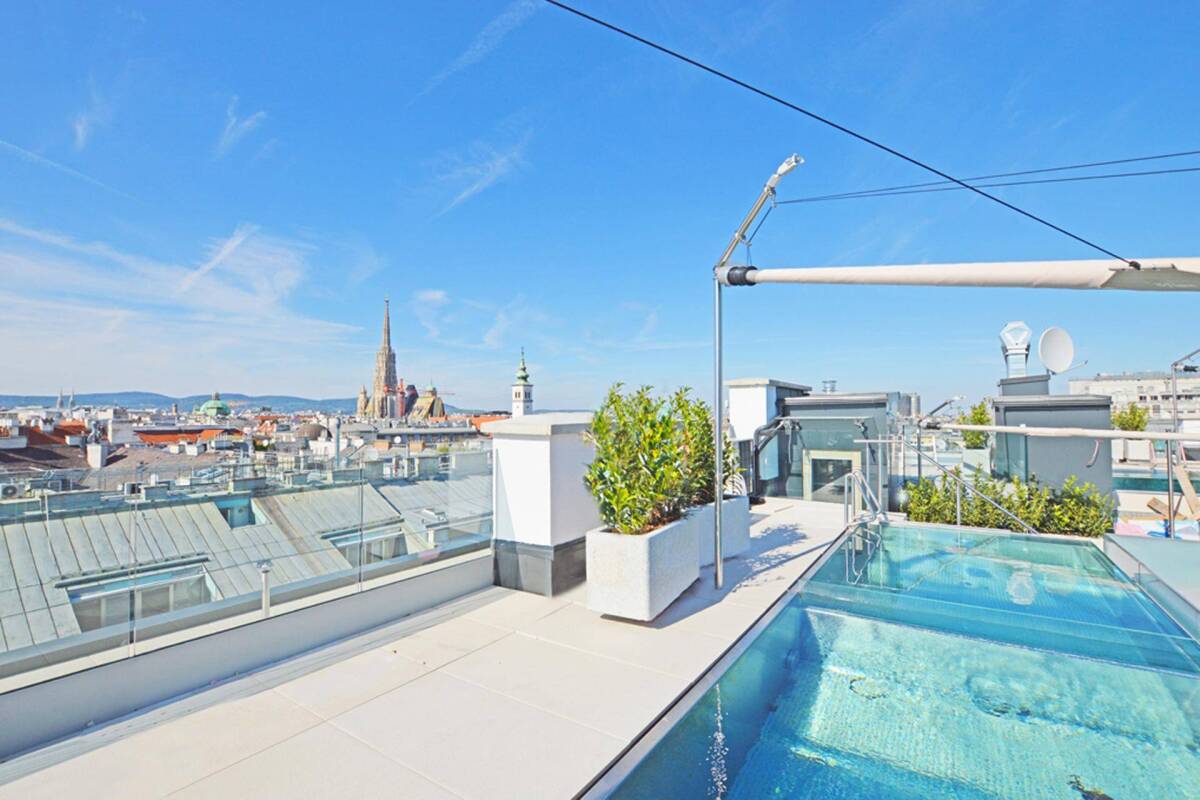 In exzellenter Art und Weise entstand auf einem grundlegend sanierten, herrschaftlichen Stilaltbau zwischen Ring und Stephansdom eine Dachgeschosswohnung der Superlative. Erleben Sie den Stil, die Kultur und den Charme einer wunderbaren vergangenen Zeit in neuem Glanz. In dieser sehenswerten Umgebung zeigt sich, warum das malerische Wien als eine der schönsten und lebenswertesten Großstädte der Welt gilt. Diese großartige Dachgeschosswohnung bietet Ihnen auf einer Wohnfläche von ca. 329 qm ein grandioses Raumkonzept auf drei Ebenen, eine Ausstattung mit erstklassigen Materialien und modernste energieeffiziente Technik. Auf der ersten Wohnebene, die ca. 159 qm umfasst, befinden sich ein großzügiges Entree sowie drei Schlafzimmer mit jeweils eigenem Schrankraum und Badezimmer en suite. Über eine imposante Treppe oder den eigenen privaten Lift in der Wohnung gelangt man auf die zweite ca. 147 qm große Wohnebene mit Loungebereich, großzügiger Küche, Essbereich und zusätzlichem Gäste-WC. Die direkt begehbare Terrasse komplettiert mit einer großflächigen Panoramaverglasung diese Ebene. Um den 360° Rundumblick über Wien zu genießen, begibt man sich auf die Dachterrasse und lässt die lauen Wiener Sommernächte mit einem Sprung in den Infinitypool auf sich wirken. Hausinterne Parkplätze sowie ein eigenes Fitnesscenter mit Spabereich und einem eigenen Weinkeller runden das Angebot dieser Traumimmobilie ab.