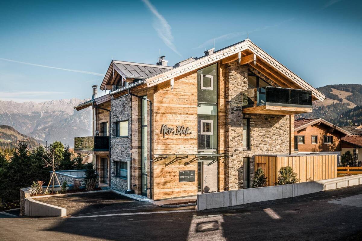 Das „Meer.Blick.“ ist ein exklusives Apartmenthaus in absoluter Top-Lage in der Skiregion Saalbach Hinterglemm Leogang Fieberbrunn direkt am Skilift „Steinbergbahn“. Der Ansitz mit 5 Ferienwohnungen zur Langzeitmiete ist in einer beliebten, ruhigen Wohnlage in der 3.000 Einwohner zählenden Gemeinde Leogang, auf 800 m Seehöhe errichtet. Der atemberaubende Blick auf die Leoganger Steinberge mit dem Gipfel des Birnhorns im Norden und der grandiose Weitblick auf die Gipfel des Steinernen Meeres im Osten sind Inspiration und Namensgeber für das im alpinen Stil gestaltete Haus „Meer.Blick.“ Der Einstieg in das größte zusammenhängende Skigebiet Österreichs, Saalbach-Hinterglemm-Leogang-Fieberbrunn und dem größten Mountain Bikepark Europas am „Asitz“ in Leogang, liegt praktisch direkt vor der Haustüre. In exklusiver Lage entstanden fünf Ferien - Apartments in einem edlen Alpinstil. Traditionelle Architektur trifft auf Design im Zeitgeist, alpine Charakteristik und auf modernste Bautechnik. Die Fassade ist in Altholz, Stein und Glas geformt. Alle Apartments verfügen über großzügige Terrassen oder Balkone, welche sich durch die freie Sicht auf die Leoganger Steinberge und auf das Steinerne Meer ermöglichen. Alle Apartments zeichnen sich durch raffinierte Grundrisslösungen und stilsichere Einrichtung und Ausstattung aus. Bodentiefe Fensteröffnungen zu den großzügigen Balkonen und Terrassen schaffen eine echte Wohnraumerweiterung für ein außergewöhnliches Wohn- und Naturerlebnis. Innentüren mit Holzoberflächen, Holzböden, Holz-Alufenster mit 3-fach Isolierverglasung, kontrollierte Wohnraumlüftung, Warmwasser-Fußbodenheizung mit Einzelraumsteuerung, Wärmepumpe mit Tiefensonde und Ökostrom (Photovoltaik-Anlage), Kabel TV, Internet Anschluss und Wlan, großzügige Badezimmer, KLAFS-Sauna und Holz-Kaminofen in dem Apartment unterstreichen den hohen Qualitätsstandard und luxuriösen Komfort. Top 5 (Penthouse): Exklusive Wohnung, luxuriöse Ausstattung (z.B. Einbauküche), raffinierte Grundrisslösungen und hochwertig möbliert, Altholzverkleidung im Außenbereich, Holzböden, Holzinnentüren und hochwertige Tischlermöbel und ein geräumiger Schrankraum, ca. 97m² Wohnnutzfläche, 2 Schlafzimmer, 2 Bäder, hochwertige KLAFS-Sauna zum Entspannen, offener Wohn/-Essbereich mit einem Holzkaminofen, Balkon mit Whirlpool. Whirlpool, Wohn-/Schlafzimmer, Bäder und Sauna teilweise mit atemberaubenden Blick auf die umliegende Berglandschaft. Kontrollierte Wohnraumlüftung, Fußbodenheizung, PANASONIC UHD LED-TV (in Wohn- und Schlafräumen), Kabel TV, Internet Anschluss, Wlan, zentrale Brandmeldeanlage (Rauch, CO) 1 Tiefgaragenstellplatz, 1 Außenstellplatz, Kellerabteil, Skikeller mit großem individuellem absperrbaren Skispind für Helm und Ski inkl. Skischuhtrockner. Erstbezug, Ausstattung absolut neuwertig. weitere Infos unter www.meerblick-leogang.at