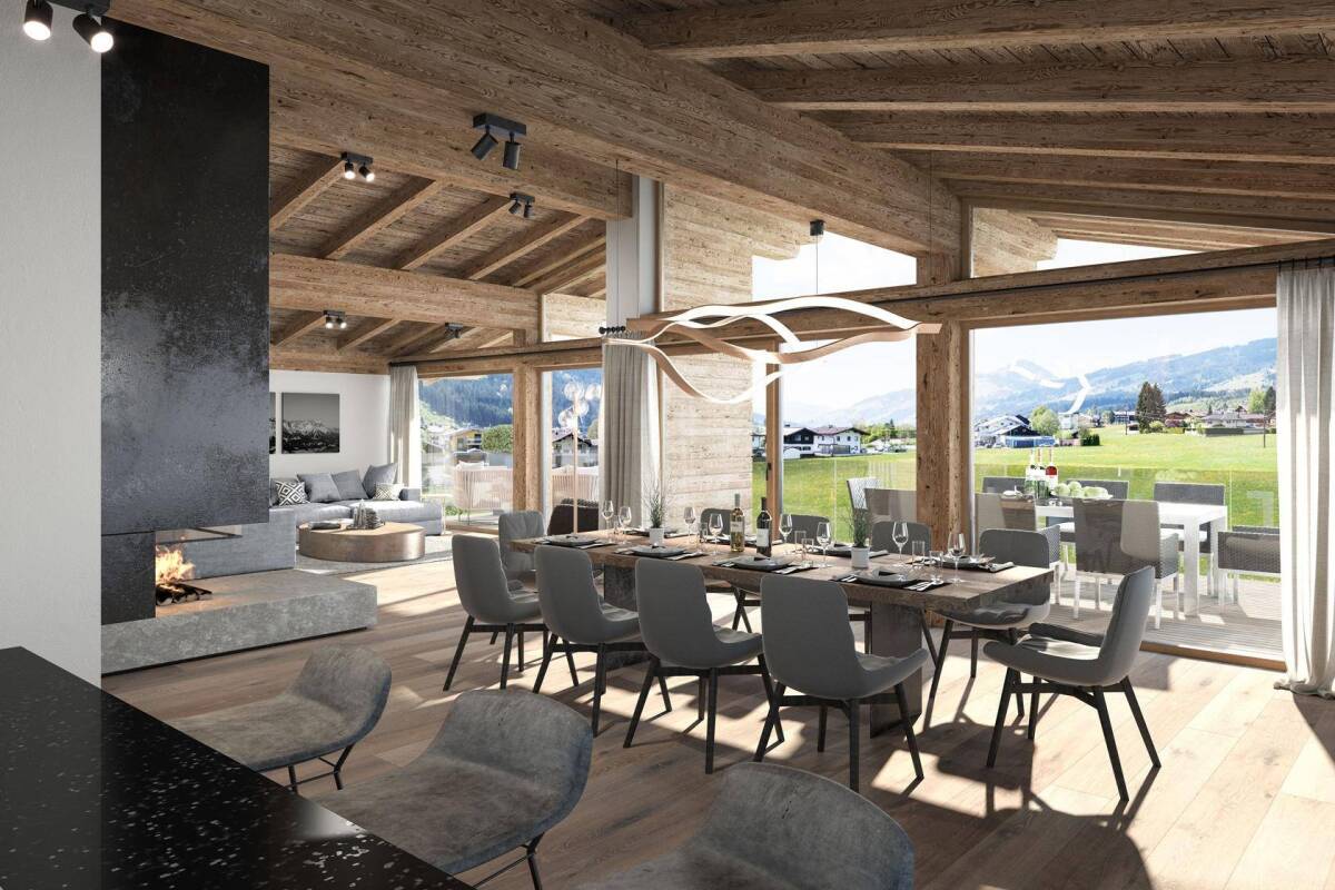 Dieses sich am Beginn der Bauphase befindliche Luxuschalet im modernen, alpinen Stil mit zahlreichen traditionellen Elementen wird seine neuen Eigentümer begeistern. Neben der hervorragenden Bauqualität und höchster technischer Ausstattung sollten die edlen Materialien, welche in sämtlichen Bereichen verbaut wurden, erwähnt bleiben. Die Fassade weist typische Kitzbüheler Stilelemente wie hochwertiges Altholz, raumhohe Fensterfronten und edlen Naturstein auf. Durch die gelungene Ausrichtung können die neuen Eigentümer viel Sonne von morgens bis abends sowie einen atemberaubenden und unverbauten Ausblick in die Tiroler Bergwelt genießen. Hier finden Sie eine Lebensqualität auf höchstem Niveau vor. Beim Betreten des Erdgeschoßes durch eine massive Altholztüre erreichen Sie das ca. 15 Quadratmeter große Foyer, welches ausreichend Platz für die Unterbringung einer großzügigen Garderobe und Schränke bietet. Diese Ebene fungiert als Schlafebene. Hier sind zwei lichtdurchflutete Schlafzimmer mit Bädern en suite und der Masterbereich mit eigenem Schrankraum untergebracht. Vom Masterschlafzimmer und von einem weiteren Schlafzimmer aus gelangen Sie direkt auf die geräumige Terrasse, die zum Verweilen einlädt, denn der Blick ist traumhaft schön. Über eine repräsentative Treppe oder mit dem Personenaufzug gelangen Sie in den mit 80 Quadratmetern großzügig bemessenen Wohn-Essbereich. Durch die durchgehende süd-westliche bodentiefe Glasfront gelangt ausgesprochen viel Tageslicht ins Innere dieser Etage. Auch hier wird Sie gleich wieder der Ausblick über grüne Wiesen und Felder hinweg auf die umliegende Bergwelt in seinen Bann ziehen. Sie sind im Dachgeschoß im wahren Highlight dieser attraktiven Immobilie angelangt. Die im Angebotspreis inkludierte Profiküche mit Fronten aus Altholz und nanoschwarz ist perfekt ins wohldurchdachte Wohnkonzept integriert und erfreut Hobbyköche genauso wie Profiköche. Erwähnenswert sind sicherlich der von Meisterhand gefertigte Holzsichtdachstuhl, der ausgesprochen stylisch gestaltete Kamin und die geräumige Terrasse. Eine Gästetoilette und ein praktischer Abstellraum komplettieren das Wohnerlebnis auf dieser Ebene. Im Untergeschoß angekommen finden Sie ein viertes Schlafzimmer mit eigenem Bad vor. Durch den großzügig bemessenen und begehbaren Lichthof ist auch hier für ausreichend Tageslicht gesorgt. Der Wellnessbereich mit einer Altholzsauna, Infrarotkabine, Fitness- / Relaxzone und einer Wellness-Dusche wird Sie nicht nur in der kalten Jahreszeit begeistern. Der Technikraum, ein Kellerabteil, eine Toilette und ein Vorraum komplettieren diese Etage. Bei der Ausstattung dieser Immobilie wird größter Wert auf qualitative Hochwertigkeit gelegt und ausschließlich sorgfältig gewählte Materialien, wie Altholz, Naturstein, Vollholztüren in Altholz, edle Armaturen und Fliesen sowie ein BUS-System verwendet. Für Ihren Fuhrpark stehen Ihnen eine Doppelgarage und zwei Außenstellplätze zur Verfügung. Mit dieser Immobilie erwirbt man ein attraktives Eigenheim in den Tiroler Bergen mit einem sehr guten Preis-Leistungsverhältnis. Gelegenheiten wie diese gibt es nicht mehr allzu viele am Kitzbüheler Immobilienmarkt.