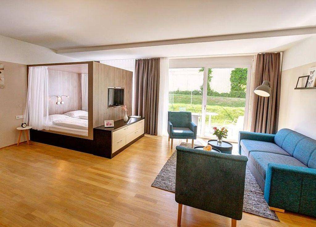 Auf 54m² bietet das Apartment einen perfekt aufgeteilten Wohn- und Schlafraum für bis zu 4 Personen. Ein räumlich abgetrenntes Doppelbett, ein gemütliches, ausziehbares Sofa sowie eine komplett eingerichtete Küche und ein qualitativ hochwertiges Badezimmer gehören hier zur Grundausstattung. Ein gemütlicher Außenbereich mit Stein-Terrasse und angrenzendem privaten Garten vermitteln ein Wohngefühl der besonderen Art.