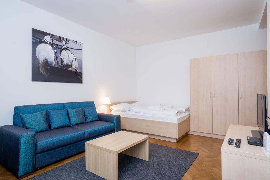 Das Executive Studio mit liegt im 2. Stock des neu sanierten Hauses und bietet mit der ausziehbaren Couch insgesamt Platz für bis zu vier Personen. Die Fläche von 32m² wurde perfekt ausgenutzt und die Wohnung ist ideal für Geschäftsreisende und Urlauber zugleich. Die voll ausgestattete, neue Markenküche und das moderne Badezimmer runden das Angebot perfekt ab.