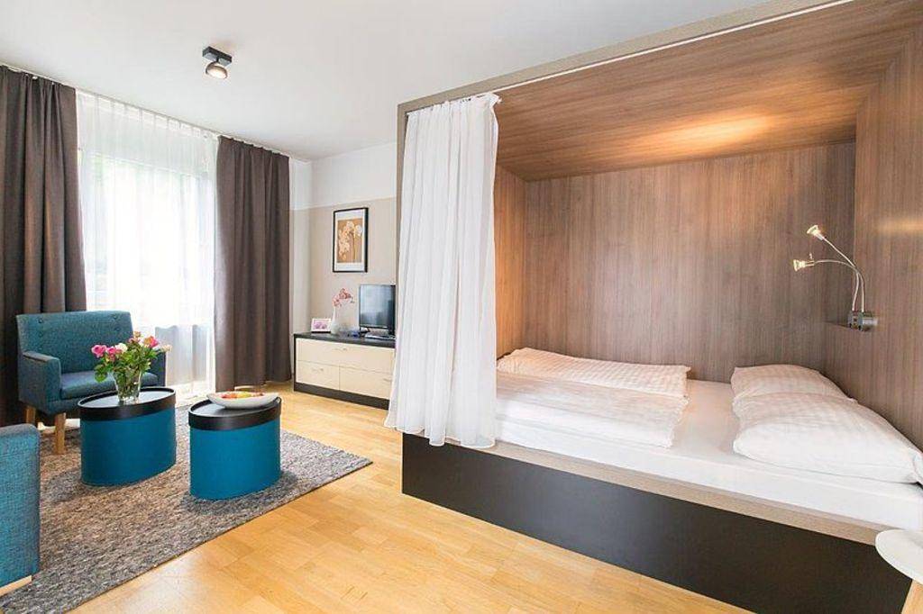 Das Apartment verfügt über eine Gesamtfläche von ca. 44m². Das stilvoll eingerichtete Apartment bietet einen großzügigen Wohnraum mit Küche, einen optisch abgetrennten Schlafbereich mit Doppelbett & ausziehbarem Schlafsofa sowie einen kleinen Garten und ein modernes Badezimmer mit Dusche. Die Küche ist ausgestattet mit Mikrowelle, Kühlschrank, Tiefkühler und Herd. Teilweise befinden sich in den Küchen auch ein Ofen und Geschirrspüler. Bett- & Geschirrwäsche sowie Handtücher werden als Erstausstattung zur Verfügung gestellt.