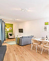 Gründerzeithaus und sind die ideale Basis für ihren Wien-Aufenthalt. Die intelligente Raumgestaltung schafft getrennte Bereiche für Schlafen, Kochen und Wohnen und bietet somit für Home Office ebenso Platz wie für private Treffen.Voll ausgestattete Küchen inklusive Besteck, Geschirr, Töpfe, Pfannen und Zubehör bieten dem Hobbykoch ausreichend Gestaltungsmöglichkeiten. Eine hauseigene Waschküche mit Waschmaschine und Trockner sind vorhanden.Highlight und Treffpunkt ist die große öffentliche Dachterrasse mit wunderschönem Blick über die Stadt.
