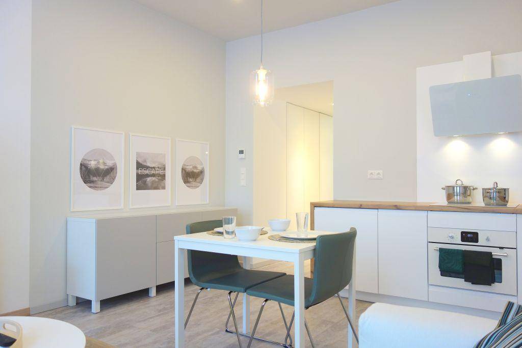 Die Küche ist voll ausgestattet mit Töpfen, Pfannen, Besteck, Tellern, Gläsern und einer Basisaustattung weiterer Küchenutensilien, die man für einen längeren Aufenthalt benötigt. Eine Espressomaschine ist ebenfalls inkludiert, wie ein Kühlschrank mit TK-Fach, Herd, Ofen und ein Geschirrspüler. Das Studio besitzt ein Wohn/Schlafzimmer mit ausreichend Platz zum Wohnen, Essen und Arbeiten. So finden Sie nicht nur ein gemütliches Sofa mit perfektem Blick zum großen LCD-TV, sondern auch ein solider Esstisch und ein kleiner Schreibtisch für Homeoffice. Zum Schlafen kann ein vollständiges Doppelbett aus der Wand herausgeklappt und unter tags vollständig versteckt werden. Mit Schränken und Laden bieten diese Wohnungen ausreichend Stauraum auch für lange Aufenthalte in Wien.