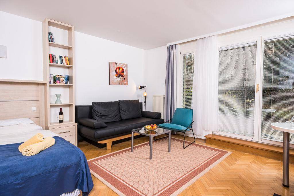 Diese 40m² Studio ist die perfekte Kombination aus Wohnen in der Stadt und Komfort im Grünen.Der Wohn-Schlafraum öffnet sich direkt in den Garten mit eigener Terrasse. Gerade in der warmen Jahreszeit ist dies ideal. Im Vorraum finden Sie ausreichend Stauraum für all Ihre Sachen. Das Badezimmer hat eine Badewanne.