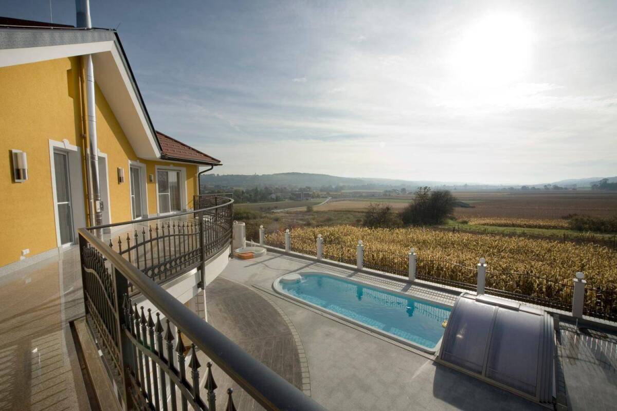 Dieses herrschaftliche Anwesen befindet sich in unmittelbarer Nähe des Golfplatzes, in einer der exklusivsten Lagen der Thermen und Golfregion Bad Waltersdorf. Das Objekt liegt besonders ruhig am Ende einer Sackgasse. Die wunderschöne Gartenanlage vermittelt mediterranes Flair. Vom Garten sowie von der Terrasse genießen Sie eine herrliche Aussicht. Das Haus wurde 2006 in Massivbauweise errichtet. Für die Ausstattung der Villa wurden ausschließlich edelste Materialen verwendet. Die Fußböden bestehen teilweise aus Granit und aus Holz. Das Wohnhaus zeichnet sich durch ein besonders durchdachtes Raumkonzept aus. Schon beim Betreten des Eingangsbereiches spürt man die Exklusivität dieser Immobilie. Vom Foyer führt eine imposante Treppe ins Obergeschoß. Im EG befindet sich eine moderne, funktionelle Küche, ein Wohnzimmer mit stylischem Bar Bereich. Auf derselben Ebene befindet sich ein separat begehbares Office sowie ein Wellnessbereich mit Ausgang zur Terrasse, eine Gästetoilette, ein Wirtschaftsraum und ein Garderobenraum. Der gesamte Wohnbereich ist mit großzügigen Fensterflächen versehen von welchen man den gesamten Poolbereich überblickt. Im Obergeschoß befinden sich 3 edelst ausgestattete Bäder sowie 4 Zimmer und ein großzügiger Schrankraum. Jedes Schlafzimmer bietet einen Ausgang auf die Terrasse bzw. Balkon. Ein ca. 40m² Bereich des Obergeschoßes ist über einen eigenen Zugang von außen erreichbar und kann somit als separate Wohnung genutzt werden. Weiteres verfügt das Objekt über eine Doppelgarage von welcher man direkt ins Haus gelangt. Die gesamte Garage ist unterkellert. Insgesamt stehen 4 Garagenplätze zur Verfügung. Die Liegenschaft verfügt über zahlreiche weitere Extras, wie: Weinkeller, Gartenhaus mit Pizzaofen, Poolbereich mit Aussendusche, Laube und Biotop. Beheizt wird das Objekt mittels Pelletsheizung sowie Solar und Photovoltaikanlage. Zusätzlich sorgt ein Kaminofen für angenehme Wärme. Das gesamte Haus ist mit Fußbodenheizung ausgestattet. Die parkähnliche Aussenanlage bietet zahlreiche einladende Plätzchen zum Verweilen. Der herrliche Garten ist üppig mit Ziersträuchern und Obstbäumen bepflanzt. Das Grundstück ist komplett eingezäunt und mit elektrischem Einfahrtstor versehen. Ein 18 Loch Golfplatz befindet sich im Ort und ist zu Fuß gut erreichbar. Entfernungen: Nächster Supermarkt ca. 800 m Autobahnanschluss ca. 1,5 km Graz ca. 50 km Wien ca. 130 km