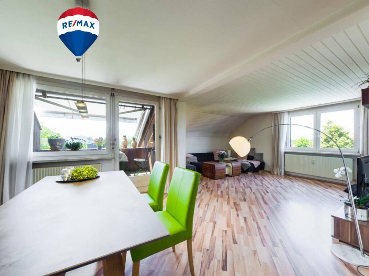 zwei gemütliche Balkone Schwedenofen im Ess-/Wohnbereich zentrale Lage Blick ins Grüne helle Küche Rückzugszimmer im Dachgeschoss Tiefgaragenplatz und genügend Besucherparkplätze