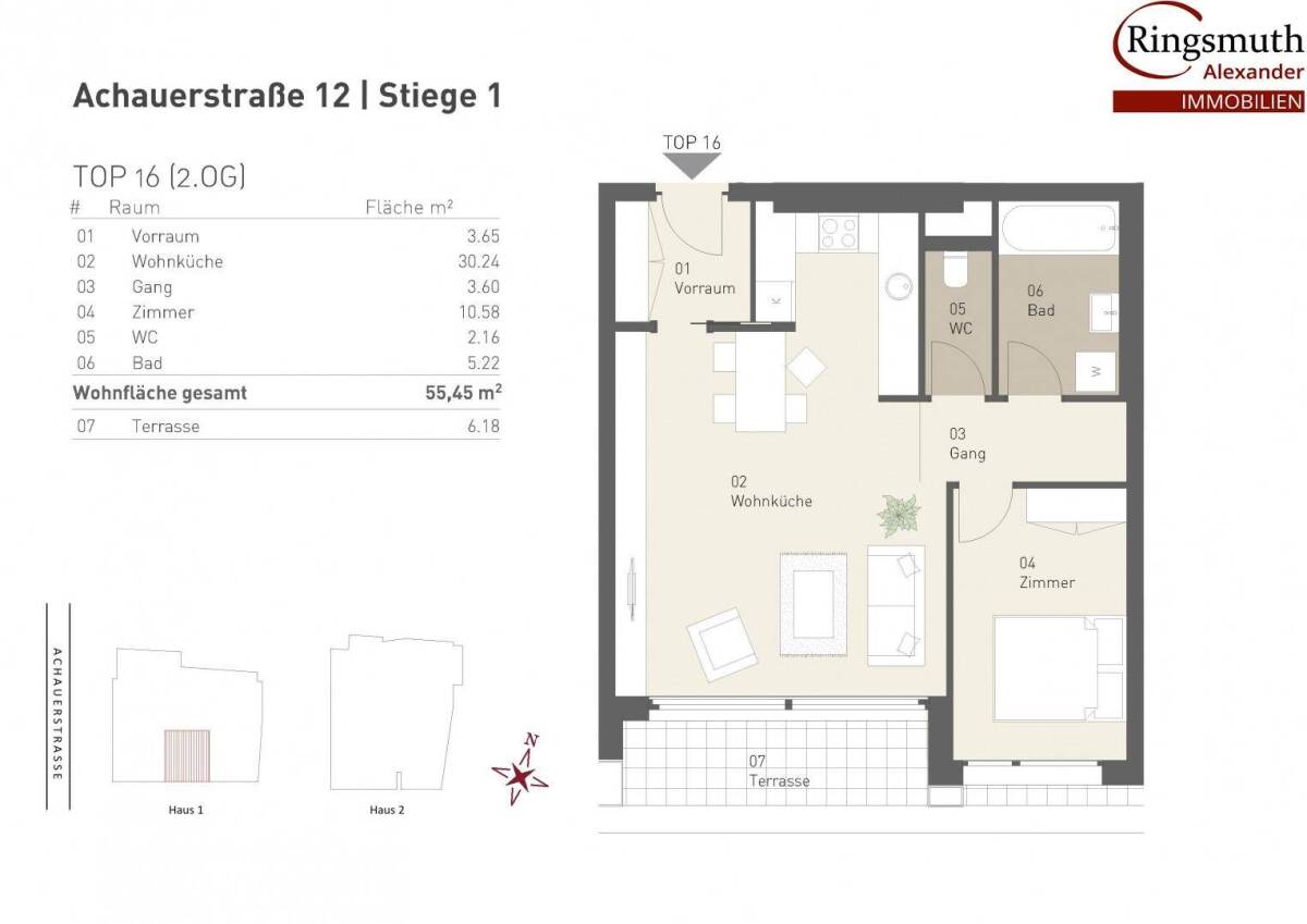2 Neue Wohnbauprojekte in Leopoldsdorf: www.leo12.at und www.ziag144.atDie zeitlose Architektur des Neubauprojekts spiegelt die optimale Balance zwischen Natur und Stadtleben wider. Die Vorzüge „am Land“ zu wohnen und doch innerhalb nur weniger Minuten im Zentrum, am Puls der Bundeshauptstadt zu sein – das bedeutet Lebensqualität.In zentraler Lage Leopoldsdorfs befindet sich dieses feine und energieeffiziente Wohnanlageprojekt „Leo 12“, bestehend aus zwei Baukörpern mit insgesamt 30 Wohnungen zwischen 43 und 92m², einem Straßenlokal mit Geschäfts- oder Ordinationseignung und 62 Tiefgaragenplätzen. Jede Wohnung verfügt über Außenflächen wie Gärten, Terrassen oder Balkone.Die kurze Distanz zu Wien (ca. 4,1km zur U1 Neulaa; auch ein Radweg führt dorthin), sowie die Anbindung an das öffentliche Verkehrsnetz macht diese Immobilie sowohl für Eigennutzer als auch für Anleger hochinteressant. Sie erreichen mit der U1 bequem und in nur 16 Minuten die Innenstadt Wiens.Kurzinfo Lagevor den Toren Wiensmit dem Fahrrad nach Wien in nur ca. 15min bis zur U1 „Neulaa“Supermarkt und Nahversorger fußläufig gut erreichbar (z.B. Merkur)Zentrale Ortslage: Gemeindeamt, Volksschule, öffentliche Ökoschule, Kindergärten und Allgemeinärzte etc. sind zu Fuß erreichbar, ca. 500m entferntabwechslungsreiche Gastronomie vom Restaurant bis zum urigen HeurigenVielfältige Möglichkeiten für Sport und Freizeit: Fußball, Golf, Reiten, Fischen, etc. Badebiotope in der Umgebung schaffen einen hohen ErholungswertKurzinfo Ausführung und Ausstattung1 bis 4-Zimmerwohnungen zw. 43 und 92m² mit Gärten, Terrassen oder BalkoneZiegelmassiv-BauweiseVollwärmeschutzfassadehochwertige Aluminiumfenster mit 3-Schichtverglasung und Sonnenschutzelementenwartungsfreie FernwärmeFußbodenheizung, Mehrschicht-Fertigparkettgroßformatige keramische Fliesen bzw. Feinsteinzeug hochwertige Sanitäreinrichtungen Kellerabteil, Fahrradraum, KinderwagenraumDer Verkauf erfolgt provisionsfrei! Alle Preise verstehen sich in schlüsselfertiger Ausführung! (ohne Kücheneinrichtung)Die Betriebskosten werden sich auf ca. 2,-- Euro (Hausbetriebskosten, Verwaltung und Instandhaltungsrücklage) per Quadratmeter Wohnnutzfläche belaufen.Sie denken an eine Vorsorgewohnung: Anlegerpreise mit Umsatzsteuerausweisung bitte auf Anfrage, wir beraten Sie sehr gerne! Wohnung Haus 1 Top 16 (2.OG) Diese exklusive 2-Zimmer Wohnung mit 56,19 m2 und ca. 6 m2 Terrasse erfüllt alle Wünsche und gliedert sich in folgende Raumaufteilung:Vorraum 3,65 m2Wohnküche 30,24 m2Gang 3,60 m2Zimmer 10,58 m2WC 2,16 m2Badezimmer mit Wanne, Handwaschbecken, und Waschmaschinenanschluss 5,22 m2Terrasse 6,18 m2Der Verkauf der Wohnungen erfolgt provisionsfrei! Der Fertigstellungstermin ist mit 2021 geplant. Die Wohnungen werden schlüsselfertig übergeben.Öffentliche Verkehrsanbindung: Bus 226, 227 Haltestelle Leopoldsdorf b. Wien Achauerstrasse: 24 Minuten bis Oberlaa zur U1 (U1 bis Karlsplatz 14 Min) Die SCS ist mit Auto über die S1 in 12 Minuten erreichbarDie U1 ”Neulaa” ist mit dem Auto in 8 und mit dem Fahrrad in ca. 15 Minuten erreichbarKaufpreis:Der Verkaufspreis beläuft sich auf Euro 269.684,00 Anlegerpreis: Euro 245.412,44 zzgl. 20% Ust).Es stehen gesamt 63 Stellplätze in der hauseigenen Tiefgarage zur Verfügung (Preis pro Stellplatz 18.500,--)Energieausweis:Der Heizwärmebedarf beträgt im 1. Haus 31,14 kWh/m²a und im 2. Haus 37,44 kWh/m²a, welcher der Klasse B entspricht.Gerne steht Ihnen Herr Alexander Ringsmuth für weitere Fragen bzw. flexibel gestaltbare Besichtigungstermine unter 0676 842 055 100 zur Verfügung. www.ringsmuth-immobilien.atWir weisen ausdrücklich auf unser wirtschaftliches Naheverhältnis mit dem Abgeber/ der Abgeberin, so wie die Doppelmaklertätigkeit, hin!Irrtum und Änderungen vorbehalten!Infrastruktur / EntfernungenGesundheit Arzt <500m Apotheke <500m Krankenhaus <8.000m Klinik <7.000m Kinder & Schulen Schule <500m Kindergarten <500m Universität <6.000m Höhere Schule <9.500m Nahversorgung Supermarkt <500m Bäckerei <3.500m Einkaufszentrum <4.500m Sonstige Bank <500m Geldautomat <500m Post <500m Polizei <500m Verkehr Bus <500m U-Bahn <4.000m Straßenbahn <6.000m Bahnhof <2.000m Autobahnanschluss <1.500m Angaben Entfernung Luftlinie / Quelle: OpenStreetMap