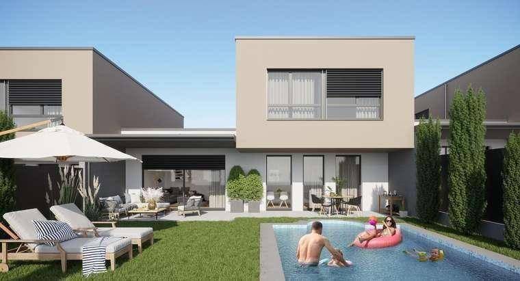 SPÜRBARE LEBENSQUALITÄT Erleben Sie mehr, genießen Sie das Besondere. Denn in Ihrem Designhaus erfahren Sie pure Wohnqualität. So gelangen Sie direkt von Ihrer Wohnküche auf die überdachte Terrasse und in Ihren vorgelagerten Garten. Und was liegt näher, als im eigenen Swimmingpool Abkühlung an heißen Sommertagen zu finden. Im Obergeschoss befinden sich drei Schlafräume sowie ein großes Bad mit separatem WC. Auf Wunsch besteht die Möglichkeit, dass Ihr Eigenheim auch unterkellert errichtet wird. Über ein Doppelcarport gelangen Sie direkt in Ihr Eigenheim.