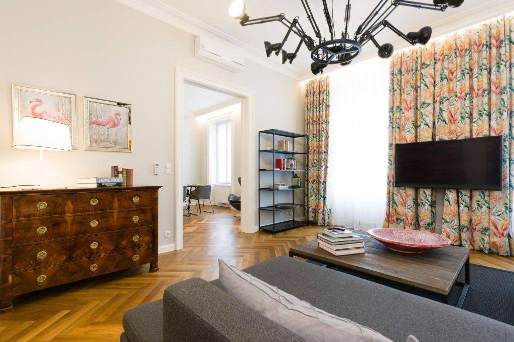 Dieses luxuriöse Apartment hat eine Fläche von 110 Quadratmetern und wurde neu renoviert. Es ist komplett ausgestattet mit eklusiven, luxuriösen Möbeln und bietet den ultimative Komfort für Ihren Aufenthalt in Wien.Beim Betreten des Apartments erwartet Sie ein großer Flur ausgestattet mit einem Spiegel und wundervollen Bildern an den Wänden. Vom Flur aus gelangen Sie gleich in das schicke Badezimmer mit einer freistehenden Badewanne und großflächiger Dusche. Es gibt eben ein seperates WC, in dem Sie auch die Waschmachine finden. Das Haus ist ein Altbau und hat daher wundervoll bestuckte hohe Decken und große Fenster, die die Räume erhellen und dem Apartment seinen eigenen Charm geben. Die Designer-Küche ist voll ausgestattet, mit allem was man im Haushalt benötigt und bietet viel Platz und Stauraum. Direkt anschließend befindet sich das Wohnzimmer mit einer großen Couch und lädt zum Entspannen ein. Es gibt hier einen Flatscreen-TV mit dem man gemütlich Netflix und reguläre TV Programme ansehen kann.Im Schlafzimmer finden Sie einen weiteren Fernseher, den man angenehm im großen Doppelbett genießen kann.Anschlißend finden Sie das zweite Schlafzimmer, welche mit einem Schlafsofa ausgestattet ist, das man bequem in ein Doppelbett ausziehen kann. In diesem Raum finden Sie ebenfalls einen Schreibtisch und somit können Sie, je nach Gebrauch, das Zimmer auch als Arbeitszimmer benutzen. Energieausweis Energieausweis ist noch nicht vorhanden / wird gerade beantragt