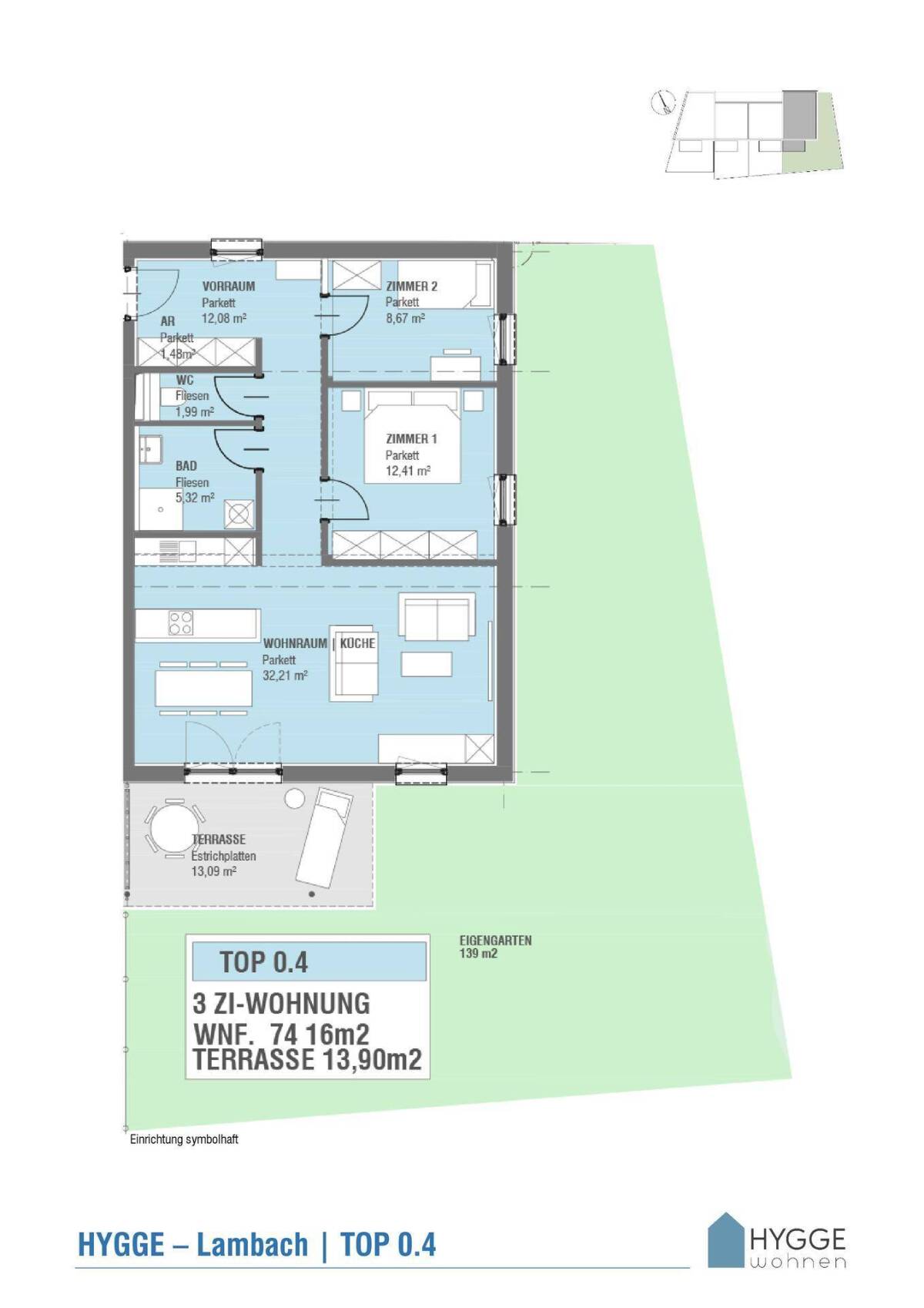 Hygge – gutes Leben - naturnahes Wohnen in Lambach Sie möchten wissen, warum die Dänen zu den glücklichsten Menschen der Welt zählen? Es ist ihr Lebensstil. Ihre besondere Art glücklich zu sein. Im Umgang mit der Natur, im Beisammensein mit ihren Freunden, im Erfreuen an den kleinen Dingen. Für diese Form des Glücklichseins haben sie auch einen Namen: HYGGE. Dazu zählt auch, wie sie wohnen. Dieses skandinavische Wohn-Wohlgefühl bietet auch unser HYGGE-Projekt in Lambach. Gebaut in Holz, mit kuscheligen Sitzecken in der Wohnung und fahrradfreundlichen Einrichtungen, die es Ihnen erlauben, mit dem eigenen Fahrrad sogar in den Obergeschossen bis zur eigenen Wohnung zu fahren. Eine Besonderheit ist auch das Trio-Mobilitätskonzept bestehend aus einem E-Lastenrad und einen E-Bike, welche kostenfrei genutzt werden können. Der Lieblingsplatz der Skandinavier in ihren Wohnungen und Häusern ist der „hyggekrog“ [hüggekro]. Auch bei diesem Projekt bieten ausgesuchte Wohnungen die Möglichkeit sich zurückzuziehen, wenn man es besonders hyggelig haben möchte. Hygge bedeutet GLÜCK – ZUFRIEDENHEIT – AUSGEGLICHENHEIT und genau diese Atmosphäre wollen wir für Sie in unserem neuen Projekt schaffen. Ein Leben in naturnaher Umgebung - erfüllen Sie sich Ihren Wohntraum in einer ruhigen und dennoch zentralen Gegend. Das Projekt befindet sich in einer ruhigen Seitenstraße in Lambach, die jedoch zentrumsnahe liegt. Sie finden Nahversorger, Gastronomie, Schulen und öffentliche Verkehrsmittel in unmittelbarer Nähe. Die in Holzbauweise errichtete Wohnanlage besteht aus 14, über drei Geschosse verteilte Wohnungen in stilvoller moderner Bauweise. Im Erdgeschoss erweitern Eigengärten und Terrassen den persönlichen Wohnbereich ins Freie. In den Obergeschossen bieten teilüberdachte Balkone großzügige Außenräume. Ebenerdig stehen 10 überdeckte PKW-Parkplätze als Carports zur Verfügung, weitere 14 Parkplätze in der Tiefgarage. Zuzüglich zum Kaufpreis ist der Erwerb eines Tiefgaragenstellplatzes zum Preis von € 20.000,- obligatorisch. Weitere Carport-Stellplätze können zum Preis von je € 10.000,- optional erworben werden. Provisionsfrei vom Bauträger Mehr Infos unter: http://www.hygge-wohnen.at/?portfolio=hygge-lambach