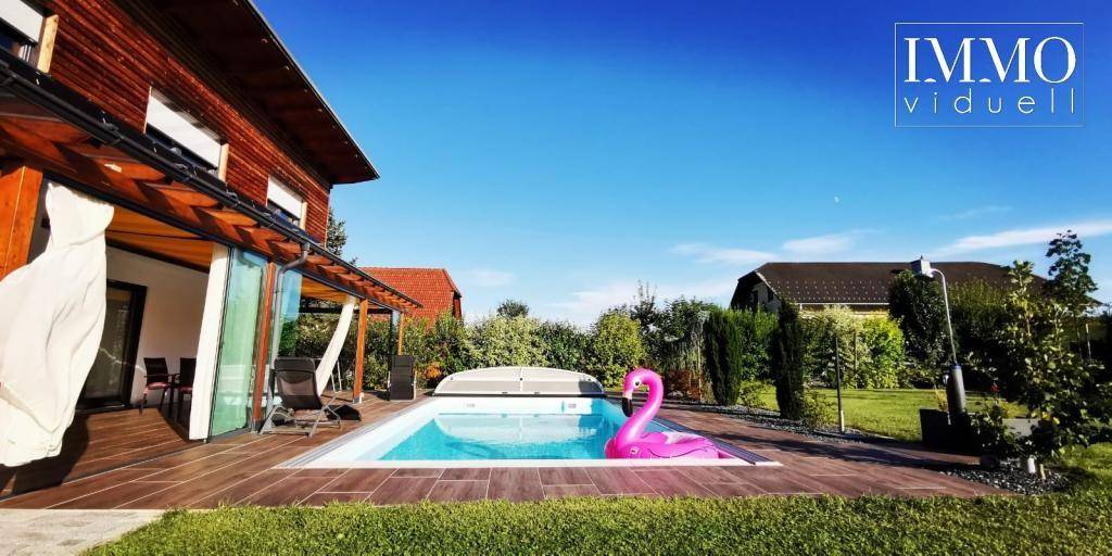 In absoluter Sonnen- und Ruhelage befindet sich dieses traumhafte Einfamilienhaus mit Ganztagssonne und Pool! Das Objekt wurde 2006/2007 erbaut und bietet als Niedrigenergiehaus viele einzigartige Extras und zusätzliche Features. Aufteilung des Objektes: Wohnfläche: ca 243 m² Zimmeranzahl: 8 Geschosszahl: 2 Keller: voll unterkellert (beheizbar) Zimmeraufteilung: 1 Vorraum, 1 Wohn- und Essbereich mit Designerküche, 7 Schlafzimmer, 1 Bad mit Wanne und Dusche, 2 x WC, 2 Abstellräume, 2 x Doppelcarport, 1 x überdachte Terrasse mit Außenküche, voll unterkellert mit Technikraum, Fitnessraum, Wirtschaftsraum etc. Extras: Pool mit Überedachung, Designer DAN Küche, Desigern Tischler Badezimmerausstattung, Elektrische Rolläden und Insektenschutz, Boiler 285 Liter, Gartenhütte, Wäscheschacht, Staubsaugereanlage, Markisen Heizung: Zentralheizung Erdwärmetiefenbohrung Wasser: Solaraufbereitung Strom: Solaraufbereitung mit Einspeisung ins öffentliche Netz (Stromverkauf) HWB: in Arbeit Bauweise: Niedrigenergiehaus (Holzriegelbauweise) Baujahr: 2006/2007 Zustand: Sehr Gut zusätzliche Infos: Ruhelage, Schulbus, Einkaufsmöglichkeiten Kaufpreis: auf Anfrage Provision: 3 Prozent zzgl. gesetzlicher Umsatzsteuer Vereinbaren Sie noch heute Ihren Besichtigungstermin für Ihr neue Wohlfühloase! Der guten Ordnung halber, weisen wir darauf hin, dass nur Anfragen mit vollständigen Kontaktdaten (Name, Adresse, Mail und Telefonnummer) beantwortet werden. Genießen Sie unseren kompetenten Rundumservice und lassen Sie sich zu Ihrer Traumimmobilie Ihre individuelle und maßgeschneiderte Finanzierung anbieten - Ganz nach dem Motto: Wir sind IMMOviduell und verhelfen mit individuellen Lösungen ins Eigenheim!