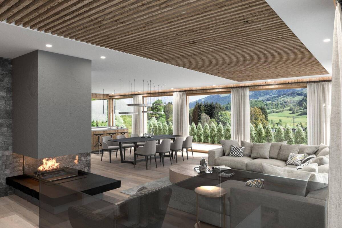 In idyllischer, etwas erhöhter Lage von Aurach hat dieses exklusive Neubauprojekt seinen perfekten Platz bekommen. Ruhe, Sonne und herrliche Ausblicke bis hin zum Wilden Kaiser Gebirge bilden den Rahmen für hochwertiges Wohnen im Einklang mit der Natur. Diese besondere Basis wurde eingefangen und im Konzept des Zweifamilienhauses genial umgesetzt - die Blickachse zum Himmel wird zum ständigen Begleiter.Beide Wohnungen umfassen je eine ganze Etage und haben zusätzlich im Untergeschoss weitere Räume, die direkt über Treppe oder dem privaten Lift erreichbar sind - das Penthouse wurde bereits verkauft.Top 1 Garden Living Wohn-/Nutzfläche ca. 185 m², 3 Schlafzimmer, 3 Bäder, 3 PKW-Stellplätze in der Tiefgarage Im Erdgeschoss befinden sich der offen angelegte Wohn-Essbereich mit Küche, zwei Schlafzimmer jeweils mit eigenem Bad - die Treppe führt direkt ins Untergeschoss, wo das dritte Schlafzimmer nebst Sauna und Badezimmer eingerichtet werden kann - dieser Raum ist durch die Hanglage lichtdurchflutet mit Ausgang auf eine Terrasse. Anschließend sind Diele mit Garderobe, Gästetoilette, Hauswirtschaftsraum, Abstellraum und Zutritt zur Garage, wo sehr praktisch der zweite Abstellraum platziert ist.Die Ausstattung ist hochwertig mit edlen Materialien, schicker Einrichtung, offenem Kamin, Holzböden, Bädern mit Naturstein, modernster Haustechnik, Fußbodenheizung durch Erdwärme, Tiefgarage und Wellness. Für erholsame Stunden im Freien bieten sich die sonnigen Terrassen und der pflegeleichte Garten an.Hinweis gemäß Energieausweisvorlagegesetz: Ein Energieausweis wurde vom Eigentümer bzw. Verkäufer, nach unserer Aufklärung über die ab 1.12.2012 geltende generelle Vorlagepflicht, sowie Aufforderung zu seiner Erstellung noch nicht vorgelegt. Daher gilt zumindest eine dem Alter und der Art des Gebäudes entsprechende Gesamtenergieeffizienz als vereinbart. Wir übernehmen keinerlei Gewähr oder Haftung für die tatsächliche Energieeffizienz der angebotenen Immobilie.Infrastruktur / EntfernungenGesundheit Arzt <2.000m Apotheke <4.000m Kinder & Schulen Schule <4.000m Kindergarten <9.500m Nahversorgung Supermarkt <3.000m Bäckerei <4.000m Sonstige Bank <4.000m Geldautomat <4.000m Post <4.000m Polizei <4.500m Verkehr Bus <1.000m Bahnhof <4.000m Angaben Entfernung Luftlinie / Quelle: OpenStreetMap