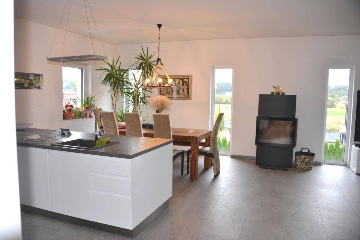 Man fühlt sich gleich wohl und geborgen. Das Haus wurde in den Hang gebaut und weist eine Grundstückgröße von ca. 944 m² auf. Das exklusive Objekt wurde im Jahr 2015-2016 errichtet. Die Nutzfläche beträgt ca.127 m². Keller mit Doppelgarage ca. 127 m². Gesamt sind 4 Zimmer vorhanden. Das Haus wurde in Ziegelmassivbauweise (25 cm) errichtet und mit einem 16 cm Grafitvollwärmeschutz versehen, wodurch man geringe Heizkosten und Betriebskosten hat. Die Beheizung erfolgt über Infrarot- Paneele. Der Verbrauch mit Strom, Heizung Warmwasser ca. 160 Euro. Kanal, Wasser, Müll, Grundsteuer im Monat ca. 60 Euro. Vom Eingangsbereich im Obergeschoß (das Objekt wurde in den Hang reingebaut) kommen Sie in den Flur. Von dort erblicken Sie schon die offene Küche mit dem geräumigen Ess- und Wohnbereich. Die 3m hohen Räume vermitteln ein besonderes Gefühl von Freiheit. Die tolle moderne Küche (Dampfgarer, Wärme-Rechaud, Induktionsherd mit Aktivkohlefilter, großer Eisschrank mit Eiscrusher uvm…) ist ein echter Blickfang. Der Neupreis der Küche beträgt inklusive Geräte ca. 20.000 Euro und ist im Kaufpreis inkludiert. In der Küche verbleibt auch ein schöner Schwedenofen. Der Ausgang zur Terrasse und Garten ist von der Küche aus vorhanden. Vom Flur kommen Sie auch noch in die 2 getrennt begehbaren Zimmer, sowie auch in das Bad. Weiters geht es in das Untergeschoß, in den ausgebauten Keller mit Wellnessbereich, wie Sauna und Kraftkammer. Der Keller verfügt über eine Toilette, einen Abstellraum und einen großen Proberaum der speziell gedämmt wurde. Dieser ist ideal für Musiker geeignet. Vom Keller kommen Sie auch direkt über eine schöne Brandschutztüre in die Doppelgarage. Von der Garage kommen Sie über den Außenbereich gut geschützt hinter die Garage. Unter der Terrasse befindet sich eine Outdoor-Theke bzw. Bar, wo Sie für Freunde und Familie tolle Feste ausrichten können. Und die Nachbarn fühlen sich dadurch nicht gestört. Über die Außentreppe kommen Sie bequem auf die obere Terrasse und wiederum in die Küche. Das topmoderne Objekt wird nach Bedarf auch teilmöbliert verkauft. Raumaufteilung: Obergeschoß: Vorraum, Toilette, Abstellraum bzw. Schuhraum, 1 offene Küche mit großzügigem Ess- und Wohnbereich mit Ausgang zur Terrasse und Garten, extra Speis, 2 Schlafzimmer, Bad mit Wanne /Dusche/Doppelwaschbecken/Tageslichtfenster Erdgeschoß bzw. Keller: Flur, 2 Zimmer, Abstellraum, Toilette, Doppelgarage Eine perfekte Infrastruktur ist gegeben, in wenigen Minuten erreichen Sie mit dem Auto diverse Nahversorger (Ärzte, Bus, Apotheke, Lebensmittel, diverse Schulen, Kindergarten..). Graz ist in ca. 30 Minuten erreichbar. Wer Wert auf Ruhe, Besinnlichkeit, reine Luft, Lebensqualität für sich und seine Kinder legt ist hier genau richtig! Zögern Sie nicht - investieren Sie in IHRE ZUKUNFT - und vereinbaren Sie gleich einen Besichtigungstermin!