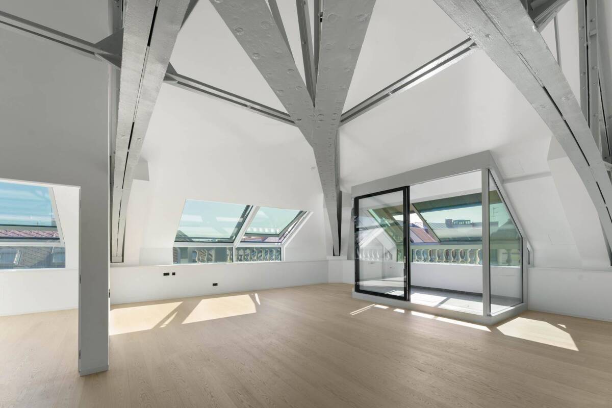 In Wiens letztem freistehenden, im Stil italienischer Renaissance gehaltenen, Prachtbau entstanden nach aufwendiger Revitalisierung 39 exklusive Stadtresidenzen der Extraklasse. Wo die Kunst und Historie der Donaumonarchie auf Moderne und Technik der Gegenwart trifft, können Sie nun im Glanz der Geschichte kaiserlich residieren. Bereits der Zugang über die mächtige Freitreppe vermittelt den Charme aus vergangener Zeit, welcher sich in höchster Perfektion bis in den letzten Winkel im Inneren dieses Meisterwerks der Baukunst fortsetzt. Dem Alltag enthoben über den Dächern der Stadt, ruhig und gleichzeitig mitten im Zentrum Wien liegt dieses eindrucksvolle Penthouse mit einer Wohnfläche von ca. 118 qm und einer Raumhöhe von bis zu 5,6 m. Die historische Dachstuhlkonstruktion aus französischem Eisen erinnert an den Eiffelturm in Paris und verleiht den hohen Räumen den besonderen Esprit der Belle Époque. Der Wohn- und Küchenbereich, zwei Schlafzimmer und die zwei Bäder werden bis ins kleinste Detail mit den besten Materialen und hochwertigsten Komponenten ausgestattet. Technische Einbauten wie das Smart Home System, Raumkühlung & Wohnraumbelüftung und Außenbeschattung sind weitere Merkmale dieses luxuriösen Immobilienangebotes. Ein Wintergarten auf Wohnebene sorgt für besonderen Flair und Wohnkomfort. Ein Concierge in der repräsentativen Lobby, ein hauseigener Weinkeller & Frischeboxen stehen den zukünftigen Bewohnern zur Verfügung.