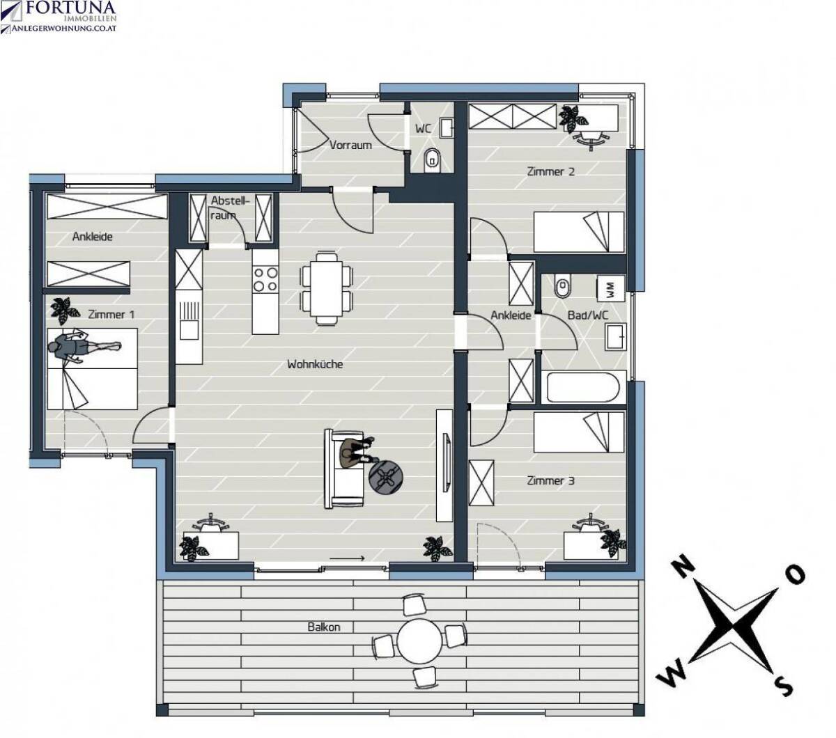 Mit dem Projekt „Silent Living“ entsteht ein besonderes Schmuckstück im trendigen Stadtteil Mariatrost. Die intelligente architektonische Gestaltung schafft eine harmonische Komposition aus privaten Bereichen und beeindruckenden Aussichtspunkten. Der hohe Anspruch an Ästhetik und die traumhafte Lage verleihen dem Projekt einen einzigartigen Charme.Die spannende Anordnung der beiden ineinander verflochtenen Baukörper schafft einen interessanten Wohnungsmix mit unterschiedlichsten Ausrichtungen und Qualitäten, die den Bewohnern ein vielseitiges Möglichkeitsfeld im urbanen Raum bieten. Die sonnige Hügellage bietet den Nutzern möglichst viel lichtdurchfluteten Wohnraum, der insbesondere auch durch die großzügigen Frei- und Grünflächen keine Wünsche offen lässt.Auch die Qualität der Ausstattung sucht ihresgleichen. Zusätzlichen Komfort bieten die 18 PKW Stellplätze. Von der 2 Zimmer Wohnung mit 45 m² bis zum Traum-Penthouse mit 160 m² Wohnfläche gibt es hier für jeden Bedarf das richtige Angebot.Mariatrost hat sich in den letzten Jahren immer mehr zum Trend-Bezirk entwickelt. Bewohner schätzen die Nähe zum Stadtzentrum, mit der gleichzeigten Möglichkeit viel Natur und Grün vor der Haustür genießen zu können. Das Projekt selbst befindet sich in einer ruhigen Seitenstraße, in sonniger Hanglage. Die öffentliche Verkehrsanbindung ist durch die nahe gelegene Straßenbahnhaltestelle sehr gut. Zahlreiche Nahversorger sowie Kindergärten, Schulen und Ärzte runden das Gesamtpaket ab.HIER GEHT ES ZUR VIDEOBESICHTIGUNG DES GRUNDSTÜCKS!Der Baustart erfolgte bereits am 14.09.2020.Top 8:Spektakuläres Wohnen auf höchstem Niveau!Auf 105 m² erstreckt sich diese ansprechende 4 Zimmer Wohnung ergänzt um einen tollen Balkon mit 30 m².Diese exklusive Traumwohnung erfüllt in Bezug auf Lage, Design, Komfort, Ausstattung und Nachhaltigkeit auch die höchsten Ansprüche und teilt sich wie folgt auf: Vorraum mit 4,3 m²Abstellraum mit 2,14 m² WC mit 1,57 m² Ankleide 1 mit 4,86 m² Ankleide 2 mit 5,86 m² Wohn- und Essbereich mit 47,62 m² Zimmer 1 mit 9,59 m² Zimmer 2 mit 11,93 m²Zimmer 3 mit 11,93 m² Badezimmer mit 5,48 m²Das smarte Innen- und Außenkonzept schafft offene Lebensräume mit Panoramafenstern und einem fließenden Übergang zur Außenfläche.Highlights der Wohnung: exklusive Ausstattung Klimaanlage auf Wunsch (gegen Aufpreis) Hochwertige Wand- und Bodenfliesen Ziegelmassivbauweise moderne Anlage in ausgezeichneter Lage mit top Infrastruktur lichtdurchflutete Wohnräume mit großzügigen Glasflächen edle Parkettböden elektrische BeschattungProfitieren Sie von allen Vorteilen die diese herausragende Lage zu bieten hat. Ruhiges Leben im Grünen, Zentrumsnähe und eine perfekte Infrastruktur sind nur einige Aspekte die dieses Projekt hervorheben.Nicht weit von der Wohnanlage entfernt: Supermärkte (Billa, Spar, Hofer) Diagnostikzentrum und Ärzte Banken und Postfiliale Volksschule und neue Mittelschule Apotheken Fitnessstudio Restaurants und Kaffeehäuser gute öffentliche VerkehrsanbindungPROVISIONSFREI für den KäuferBaubeginn: bereits erfolgtÜbergabe: Anfang 2022Alle Objekte sind selbstverständlich zum Anleger- sowie auch zum Eigennutzerpreis verfügbar.Unsere Anzeigen auf dieser Plattform stellen nur eine kleine Auswahl unseres Portfolios dar. Alle weiteren Objekte und Projekte finden sie auf unsere Homepage unter www.fortunaimmobilien.at. Für weitere Details oder zur Vereinbarung eines Beratungstermins stehe ich, Herr Mag. Klemens Hofer Ihnen unter +43 316 712 777 oder unter info@fortunaimmobilien.at, sehr gerne zur Verfügung.Ich freue mich auf Ihre Anfrage!Infrastruktur / EntfernungenGesundheit Arzt <250m Apotheke <500m Klinik <1.750m Krankenhaus <1.250m Kinder & Schulen Schule <750m Kindergarten <500m Universität <1.500m Höhere Schule <2.750m Nahversorgung Supermarkt <250m Bäckerei <1.250m Einkaufszentrum <3.250m Sonstige Bank <500m Geldautomat <500m Post <1.250m Polizei <1.750m Verkehr Bus <250m Straßenbahn <250m Autobahnanschluss <7.000m Bahnhof <2.750m Angaben Entfernung Luftlinie / Quelle: OpenStreetMap