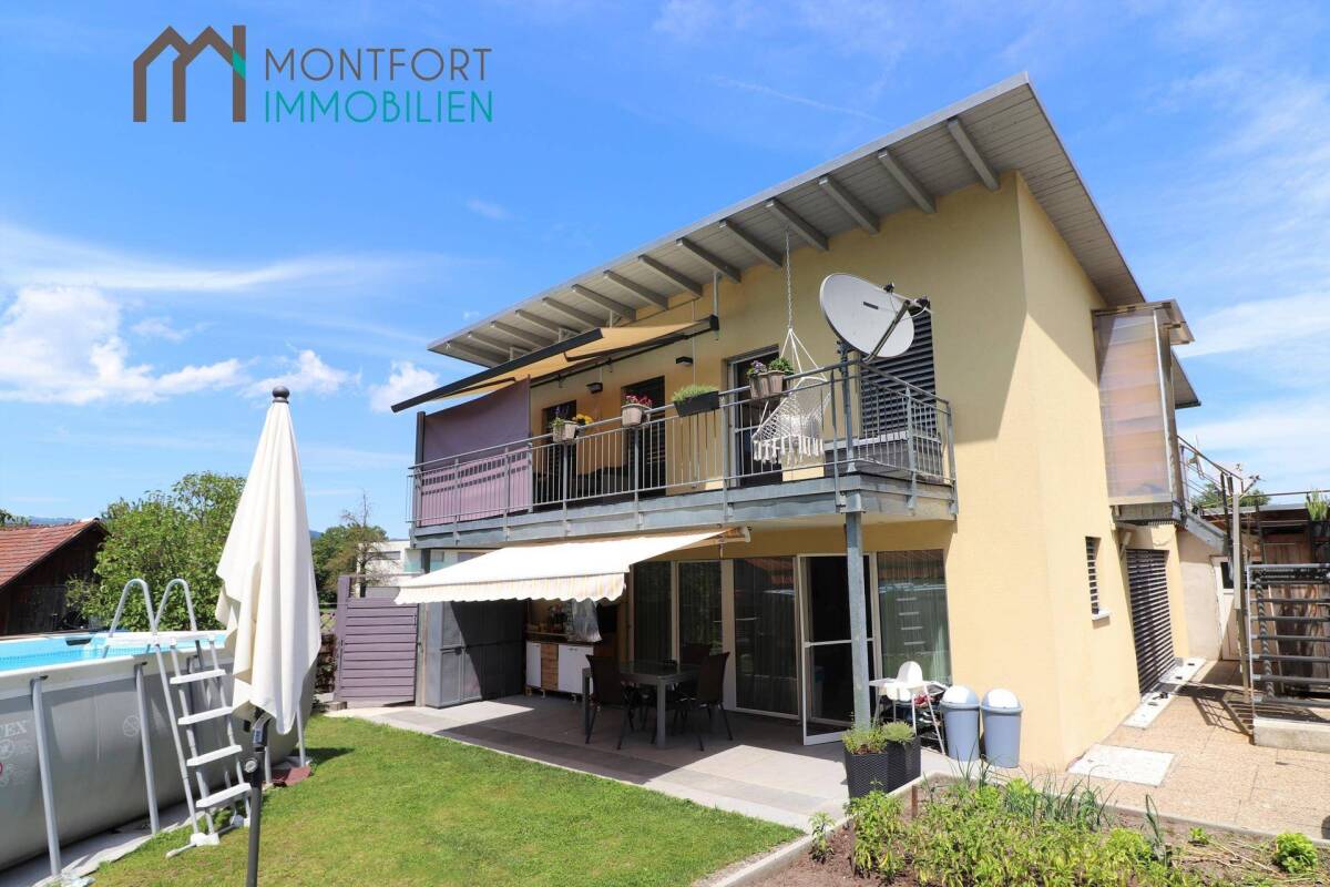Dieses attraktive 2 Familien-Haus mit hochwertiger Ausstattung befindet sich in einer sehr schönen und ruhigen Wohngegend von Koblach. Die nette Nachbarschaft ist geprägt von Einfamilienhäusern und besticht durch reichlich Natur! Das Haus war ursprünglich ein Einfamilienhaus, welches durch die aktuellen Eigentümer zwecks Bedarf in ein 2 Familienhaus mit jeweils ca. 75 m² Wfl. umfunktioniert wurde. Die obere Einheit ist durch eine von außen separat angebrachte Stiege zu erreichen. Das "alte" Treppenhaus wurde stillgelegt, kann aber jederzeit wieder "aktiviert" werden. Somit kann das Haus bei Bedarf auch mit wenig Aufwand wieder in ein klassisches Einfamilienhaus umgewandelt werden. - sehr vielen Parkmöglichkeiten - 1 Carport und 4-5 Außenstellplätze inklusive! - äußerst gepflegter Zustand - Massiv-Bauweise - angenehme Fußbodenheizung (Gas-Heizung) - liebevoll gestalteter, südlich ausgerichteter Garten - geräumiger Balkon im OG, südlich ausgerichtet - moderne Küche(n) mit Markengeräten - ruhige Lage, nur ca. 3 Gehminuten bis zum Waldrand - sehr gute Raumaufteilung in beiden Wohnungen - tolles Badezimmer mit Whirl-Wanne - maximale Flexibilität - entweder für 1 oder auch für 2 Familien bestens geeignet! Viel Platz für Sie und Ihre Liebsten – Familien werden begeistert sein! Ihr Team von Montfort Immobilien freut sich auf Ihre Anfragen!