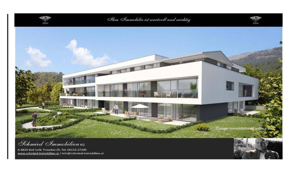 NEUBAU Eigentumswohnungen in Reitrerndorf! Wohnen im Salzkammergut, im modernen Lebensraum. Idyllische Ruhelage mit viel Sonne und Erholungswert. 23 attraktiv geschnittene Wohnungen zwischen 50 m² und 100 m² Wohnnutzfläche, zuzüglich Loggien, Terrassen, Eigengarten, Abstell- und Nebenräumen. Das Gebäude ist aufgeteilt in einen Bauteil A für eine reine Wohnnutzung und einen Bauteil B, ideal für Anlegerwohnungen und Ordinationen, usw. Fertigstellung April - August 2021 Nähere Informationen erhalten Sie bei mir im Büro Tel. 06132-27200 alexander@schmied-immobilien.atAngaben gemäß gesetzlichem Erfordernis: Heizwärmebedarf: 29.0 kWh/(m²a) Faktor Gesamtenergieeffizienz: 0.72