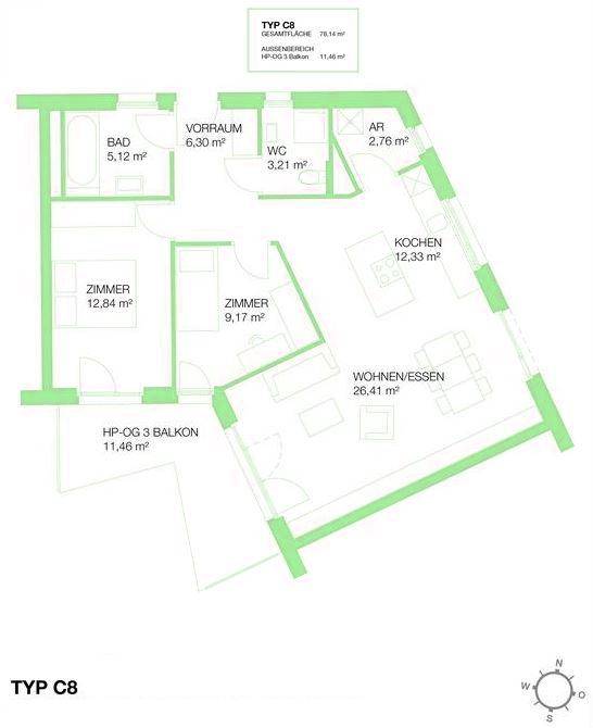 Attraktive Wohn- und Investmentmöglichkeit! Im schönen Bezirk Puntigam entsteht ein Wohnquartier mit 510 Wohnungen mit ca. 32 m2 - ca. 103 m2 Wohnfläche, das lokal, regional und auch überregional als ein besonderes Projekt mit architektonischen und planerischen Qualitäten überzeugt. Durch die Förderung sanfter Mobilitätsformen und durch die soziale Nachhaltigkeit wird das Wohnquartier ein Ort mit hoher Lebens- und Aufenthaltsqualität. Wohnungstyp C8: Wohnungen dieses Typs bieten ca. 78,14 m2 Wohnfläche und gliedern sich in einen Wohn-/Essbereich, zwei Schlafzimmer, einen Abstellraum, sowie ein Badezimmer mit Wanne, ein weiteres Badezimmer mit Dusche und WC, einen Balkon mit ca. 11,46 m2 und ein Kellerabteil. Heizung: Fernwärme Zusätzlich zu den Wohnungen entstehen im Erdgeschoss ein Gemeinschaftsraum mit ca. 65 m2 Nutzfläche, sowie Gewerbeflächen für die Nahversorgung des Quartiers. Geplanter Baustart: Jänner 2021 Geplante Fertigstellung: 4. Quartal 2023 Freiflächen: Die Grünflächen des Wohnensembles und die lichtfreundliche Architektur machen das Wohnquartier auch im Inneren erlebbar. Balkone, private Veranden, ein großzügiger Innenhof bzw. die durchgehenden Dachterrassen sorgen für eine hohe Lebensqualität. Lage und Infrastruktur: Der Standort verfügt nicht nur über eine hervorragende Infrastruktur und Verkehrsanbindung, er bietet auch reichhaltige Möglichkeiten, die Freizeit sinnvoll zu nutzen, wie zum Beispiel beim Laufen oder Radfahren in den Murauen oder bei einem Besuch im nahegelegenen Golfclub. Freizeit und Einkaufsvergnügen lassen sich auch in Seiersberg oder dem Shopping Center West ideal verbinden. Auch das Cineplexx, die Strände der CopaCabana und der Schwarzlsee sind gut erreichbar. Die Wohnungen sind nicht nur für die Eigennutzung attraktiv, sie bieten auch Anlegern optimale Voraussetzungen, denn kleinere Wohneinheiten mit innovativen Rundum-Services entsprechen der demographischen Entwicklung in Graz ebenso wie den Ansprüchen an modernes Wohnen und liefern die Basis für ein sicheres Immobilien-Investment. Kosten für Eigennutzer: ab € 261.134,- Küche: € 4.800,- Tiefgaragenplatz: € 21.240,- Motorradabstellplatz: € 8.260,- Kosten für Anleger: ab € 221.300,- Küche: € 4.000,- Tiefgaragenplatz: € 18.000,- Motorradabstellplatz: € 7.000,- Weitere Immobilienangebote finden Sie unter www.rustler.eu/immobiliensuche