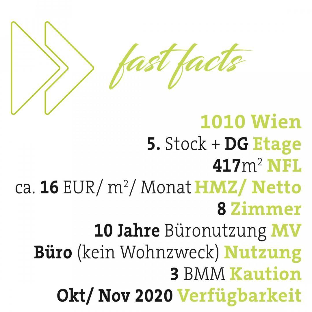 Im 5. Stockwerk eines wunderschönen Wiener Zinshauses gelegen, bieten insgesamt acht Zimmer auf zwei Ebenen perfekte Voraussetzungen für diverseste Teamgrößen und -konstellationen. Und das mit herrlichen Aussichten bis hin zum Stephansdom.Die Büroflächen verfügen über insgesamt knapp 417m².Gleich besichtigen und erfolgsversprechende Aussichten genießen.Bei weiterführendem Interesse erreichen Sie uns jederzeit gern unter elisabeth.rist@wpb-makler.com oder telefonisch unter +43 (0)664 412 90 08.Verfügbarkeit ab Oktober / November 2020Befristung auf 10 Jahre.Flächen & Kosten Geschosse: 5. Stock + DachgeschossNutzfläche: ca. 417m2 HMZ Netto/m²/Monat: € 15,91/m²Betriebskosten netto/m²/Monat: € 1,87/m²Kaution: 3 BruttomonatsmietenProvision: 3 Bruttomonatsmieten + 20% USt.AusstattungGroße EinbaukücheTeeküche Toiletten auf zwei EbenenServerraum (klimatisiert)Parkettboden in BüroräumenUntergeschoss Aufgliederung Großzügiger Empfangsbereich4 ZimmerTeeküche2 Toiletten1 NebenraumObergeschoss Aufgliederung Serverraum (klimatisiert)4 Zimmergroße Einbauküche2 ToilettenWir machen darauf aufmerksam, dass zwischen der WIENER PRIVATBANK Immobilienmakler GmbH und dem Auftraggeber ein wirtschaftliches Naheverhältnis besteht. Die WIENER PRIVATBANK Immobilienmakler GmbH ist als Doppelmakler tätig.Infrastruktur / EntfernungenGesundheit Arzt <500m Apotheke <500m Krankenhaus <1.500m Klinik <1.500m Kinder & Schulen Schule <500m Kindergarten <500m Universität <500m Höhere Schule <1.500m Nahversorgung Supermarkt <500m Bäckerei <500m Einkaufszentrum <1.500m Sonstige Bank <500m Geldautomat <500m Post <500m Polizei <500m Verkehr Bus <500m Straßenbahn <500m U-Bahn <500m Bahnhof <500m Autobahnanschluss <3.500m Angaben Entfernung Luftlinie / Quelle: OpenStreetMap