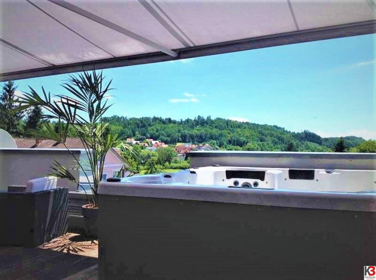 Ein stylisches, 113m² Penthouse mit einer sehr guten Raumaufteilung! Sie können das Penthouse barrierefrei mit dem Lift erreichen:) EG:, heller offener Ess-Küchenbereich mit Zugang zum idyllischen 82,52m² Garten! Böden Granit mit Fußbodenheizung! Inklusive einer Küche mit Miele Geräten.2 Zimmer, schönes Bad mit Eckwanne, WC getrennt. Durch eine elegante Treppe gelangen Sie in das Obergeschoss. Heller großzügiger Wohnbereich mit Panoramafenster, inklusive TV, Musik! Vom Wohnbereich haben Sie Zugang zur 37m² Dachterrasse, inklusive Whirlpool. Sehr sonnig, mit schönem Ausblick!EG: Granit Böden, Fenster mit elektrischen Rollos! Carport, 4 Stellplätze! Plus einen großen Raum mit Fußbodenheizung separat zu begehen!!!!! Sie könnten diesen Raum als Relax-Bereich, Büro, oder als Abstellfläche nutzen. Große Fensterflächen!Infrastruktur / EntfernungenGesundheit Arzt <500m Apotheke <500m Klinik <10.000m Krankenhaus <9.000m Kinder & Schulen Schule <500m Kindergarten <4.000m Universität <8.500m Höhere Schule <10.000m Nahversorgung Supermarkt <500m Bäckerei <500m Einkaufszentrum <5.500m Sonstige Geldautomat <500m Bank <500m Post <500m Polizei <500m Verkehr Bus <500m Straßenbahn <7.000m Autobahnanschluss <4.000m Bahnhof <4.500m Flughafen <5.500m Angaben Entfernung Luftlinie / Quelle: OpenStreetMap