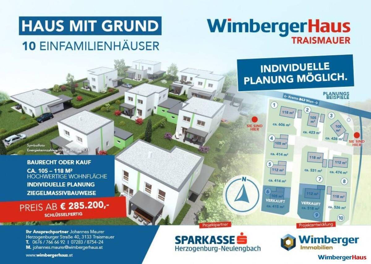 Sie möchten ein Einfamilienhaus im Grünen in Stadtnähe und mit bester Infrastruktur – und natürlich möchten Sie auch bei der Wohnqualität auf nichts verzichten? Dann ist ein individuell planbares Ziegelmassiv-Einfamilienhaus in Traismauer ideal für Sie!INDIVIDUELLE PLANUNG MÖGLICH!Planungsbeispiel Haus 1• Wohnfläche: 118 m² • Grundfläche: 606 m² • Geschoße: 2 • Preis: € 324.900 (Schlüsselfertig inkl. Grundstück) • Grundstück: Baurecht oder Kauf • Garage, Carport, etc. als OptionICH BAU MIT! SYSTEM MITHELFEN UND SPAREN Bei jeder individuell geplanten Variante des Einfamilienhauses kann das bewährte ICH BAU MIT! System gewählt werden, mit dem durch eigene Mithilfe die Kosten für den Rohbau deutlich gesenkt werden können.In sehr guter Lage sind noch hochwertig ausgestattete Einfamilienhäuser mit schönen Eigengärten für ein genussvolles Familienleben erhältlich.10 Einfamilienhäuserca.105-118 m2 Wohnflächeca. 414-606 m2 GrundstückPreise ab ca. € 285.200,-Grundstück ist Baurechtsgrundstück , Baurechtszins bis max. € 140,00 monatlichGarage, Carport, etc. als OptionHBWSK 46, fGEE 0,71Weitere Informationen und Terminvereinbarungen bei:Johannes Maurer WimbergerHaus Traismauer Herzogenburger Straße 40, 3133 Traismauer Tel. 0676 / 766 66 92 oder 02783 / 8754-24 E-Mail: johannes.maurer@wimbergerhaus.atwww.wimbergerhaus.atAnmerkung zu HWB und fGEE: Berechnung erfolgte mit Heizungsart Gas und Bauort Linz mit südlicher Ausrichtung des Gebäudes. Tatsächliche Werte werden dann im Zuge der individuellen Planung ermittelt.Infrastruktur / EntfernungenGesundheit Arzt <1.000m Apotheke <1.500m Klinik <7.000m Kinder & Schulen Schule <1.000m Kindergarten <1.500m Nahversorgung Supermarkt <500m Bäckerei <1.000m Einkaufszentrum <9.000m Sonstige Bank <1.000m Geldautomat <1.000m Post <1.500m Polizei <7.500m Verkehr Bus <500m Autobahnanschluss <3.000m Bahnhof <1.000m Angaben Entfernung Luftlinie / Quelle: OpenStreetMap