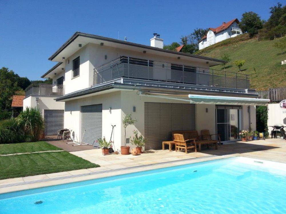 Dieses moderne Wohnhaus bietet ca. 306 m2 Wohnnutzfläche auf 3 Ebenen und verfügt überdies noch über ein Untergeschoss mit integrierter Garage, sowie einen zusätzlichen Garagenraum für Motorräder mit ca. 30 m2 Nutzfläche auf einer weiteren Ebene. Die beiden Wohnebenen gliedern sich wie folgt: Erdgeschoss: - großzügiger Vorraum mit Treppenaufgang - weitläufiger Wohn/Essbereich mit Zugang zu den Terrassen - Schlafzimmer mit Vorraum und Ankleidezimmer - ein an den Vorraum des Schlafzimmers angrenzendes Badezimmer - Wirtschaftsraum mit Zugang zu einer der Terrassen - separates WC Obergeschoss: - Diele - 4 Schlafzimmer - Badezimmer - separates WC Das Untergeschoss verfügt über ca. 87,56 m2 Nutzfläche und integriert eine Doppelgarage, sowie den Technikraum. Auf dieser Ebene befindet sich ebenfalls noch ein KFZ-Abstellplatz im Freien. Über eine überdachte Freitreppe gelangt man in einen weiteren Garagenraum für Motorräder, der sich eine Ebene tiefer befindet. Weitere Highlights sind: - beheiztes Schwimmbad mit 10 x 5 Metern, mit Abdeckung - Infrarot Kabine - Whirlpool - Elektro-Bus gesteuert - Luftwärmepumpe - Fußboden- und Wandheizung - Alarmanlage Bus - Photovoltaik Anlage (6KW) - Wasserenthärter - Brunnen Betriebskosten: Gemeindeabgaben pro Quartal: ca. € 480,- Heizkosten pro Monat ca. € 150,- Versicherung pro Monat: ca. € 80,- Lage und Infrastruktur: Absolute Traumlage am sonnigen Gedersberg! In einer ruhigen Wohngegend mit hoher Lebensqualität, bietet dieses Objekt einen großen Erholungsfaktor. Trotzdem erreicht man die Stadt in kürzester Zeit. Alle Geschäfte des täglichen Bedarfs sind mit dem Auto rasch erreichbar und auch das beliebte Einkaufscenter Shopping City Seiersberg befindet sich in der Nähe.