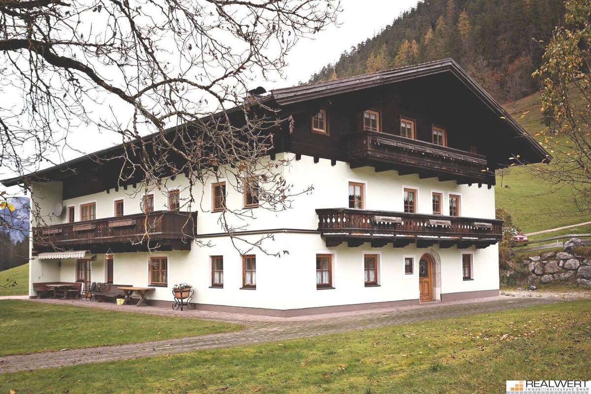 DAS WEISSBACHERGUT - Traumhafter Wohnsitz mit Potenzial Wohnhaus mit Gästezimmern und Appartements in idyllischer RuhelageAuf rund 800m Seehöhe präsentiert sich das Weissenbachergut am Rande eines kleines Weilers mit insgesamt nur fünf Wohnhäusern. Von der B 311 von Richtung Saalfelden kommend gelangt man nach ca. 2,5 km zur Liegenschaft. Der Ort ist nur über eine Straßenverbindung zu erreichen und bietet somit eine besondere Ruhelage. Zahlreiche Fahr- und Wanderwege führen in die umliegende Region, so zum Beispiel auch in den Nationalpark Berchtesgaden und zum Steinernen Meer.Das gesamt Areal verfügt über eine Grundstücksgröße von rund 13.000 m2. Es besteht aus einem großzügige Wohnhaus mit angebauter Garage, sowie einem Werkstättengebäude mit Garage für landwirtschaftliche Geräte und Heuboden. Ebenfalls zum Gutsbestand zugehörig sind diverse Weide- und Holzbezugsrechte.Die Liegenschaft eignet sich sowohl zur privaten Eigennutzung, als auch zur gemischten Nutzung zur Vermietung von Gästeappartements oder auch zur als Anlageobjekt mit Langzeitvermietung.Beschreibung WohnhausDas ursprüngliche Baujahr des Wohnhaus reicht bis in die Mitte des letzten Jahrhunderts zurück. Beginnend ab dem Jahre 1963 wurde die Ursubstanz mehrmals durch Um- und Ausbauten erweitert. Das Wohnhaus ist dreigeschossig; es besteht aus dem Erdgeschoss, einem Obergeschoss und ausgebautem Dachgeschoss. Zusätzlich verfügt es über einen kleinen Gewölbekeller, Die Bauweise ist massiv, im Erdgeschoss sind ca. 1 m starke Mauern vorhanden, das aufgehende Mauerwerk ist ebenfalls massiv. Die Dachkonstruktion ist als Alpiner Pfetten-Sparren-Dachstuhl ausgeführt. Im Jahr 2009 erfolgte die letzten Erweiterungen, bei welchen ein Windfang über die gesamte Westseite des Wohnhauses gespannt wurde und eine angeschlossene Garage sowie ein Aufgang ins 1.OG in massiver Holzbauweise errichtet wurden.Raumprogramm ErdgeschossEingangsbereich mit schönen Kreuzgewölben, Gästetoilette, Stiege, Küche, Speis, Wohnzimmer, Zimmer, Stüberl, Bad, Heizraum- / Wirtschaftsraum; Zustand: teilweise saniertRaumprogramm ObergeschossStiegenaufgang, geräumiger Dielenbereich, eine abgeschlossene 3-Zimmer Wohnung mit separatem Außenaufgang, fünf Gästezimmer, Toilette; Zustand: sanierungsbedürftigRaumprogramm Dachgeschossdrei schön ausgebaute Ferienwohnungen, zum Teil mit Sichtdachstuhl und Blick bis in den Giebel, zwei weitere Zimmer mit Nasszellen, Gästetoilette; Zustand: guter ZustandTechnische Beschreibung des WohnhausesWie augenscheinlich vorgefunden, sind die technischen Einrichtungen des Objektes funktionsfähig, weisen jedoch - dem Alter des Objektes entsprechend - Modernisierungsrückstand auf. Es ist somit von Instandsetzungsaufwendungen auszugehen, die jedoch auch von der weiteren Nutzung abhängig sind. Sämtliche Abwässer des Hauses werden über eine zweikammerige hauseigene Kläranlage/Senkgrube entsorgt. Die Sanitärinstallation stammt großteils aus den 1970iger bzw. 1980iger Jahren. Die Liegenschaft wird derzeit über die Heizanlage der Nachbarliegenschaft mitversorgt und verfügt daher über kein eigenes Heizsystem. Im Weiteren ist daher eine eigene Heizanlage zu installieren.Werkstättengebäude und landwirtschaftliche GarageDas Garagen- und Werkstättengebäude wurde 1983 errichtet und besteht aus Keller (teilunterkellert), Erdgeschoss sowie einem "Heulager" unter dem Dach. Die Grundfläche des Gebäudes beträgt ca. 150 m2. Der Keller (Werkstätte) und des Erdgeschoss sind betoniert bzw. gemauert; das Heulager ist in Holzbauweise ausgeführt. Der Freisitz und das darunter errichtete Lager sind ebenfalls in Holzbauweise ausgeführt.Weide- und HolzbezugsrechteLaut Grundbuch verfügt das Weissbachergut über das Weiderecht über 34 Joch für 12 Kühe, 12 Kälber (Galtvieh), 10 Schafe, 2 Ziegen sowie 1 Pferd und 1 Schwein. Die Liegenschaft umfasst zudem zwei Holzbezugsrechte. Zum einen für 3,32 Festmeter Bau- und Zeugholz und zum anderen 20,90 Raummeter Brennholz und 0,28 Festmeter Zaunholz.Zusammenfassung• ein überdurchschnittlich großes Wohnhaus mit ausreichend Platz für Sie und ihre Gäste oder Mieter• geeignet zur Anlage oder als Privatwohnsitz• traumhafte Ruhelage mit fast keinen Nachbarn• Gesamtgrundstücksfläche 13.000 m2• landwirtschaftliche Flächen auch geeignet für eigene Nutztierhaltung• Modernisierungsarbeiten erforderlichSollten wir Ihre Interesse für diese außergewöhnliche Liegenschaft geweckt haben, so stehen wir Ihnen gerne für weitere Informationen oder einen Besichtigungstermin zur Verfügung.Hinweis gemäß Energieausweisvorlagegesetz: Ein Energieausweis wurde vom Eigentümer bzw. Verkäufer, nach unserer Aufklärung über die ab 1.12.2012 geltende generelle Vorlagepflicht, sowie Aufforderung zu seiner Erstellung noch nicht vorgelegt. Daher gilt zumindest eine dem Alter und der Art des Gebäudes entsprechende Gesamtenergieeffizienz als vereinbart. Wir übernehmen keinerlei Gewähr oder Haftung für die tatsächliche Energieeffizienz der angebotenen Immobilie.Infrastruktur / EntfernungenGesundheit Apotheke <5.000m Kinder & Schulen Schule <3.000m Nahversorgung Supermarkt <4.000m Bäckerei <3.000m Sonstige Bank <3.000m Geldautomat <5.000m Post <3.000m Polizei <5.000m Verkehr Bus <1.500m Angaben Entfernung Luftlinie / Quelle: OpenStreetMap