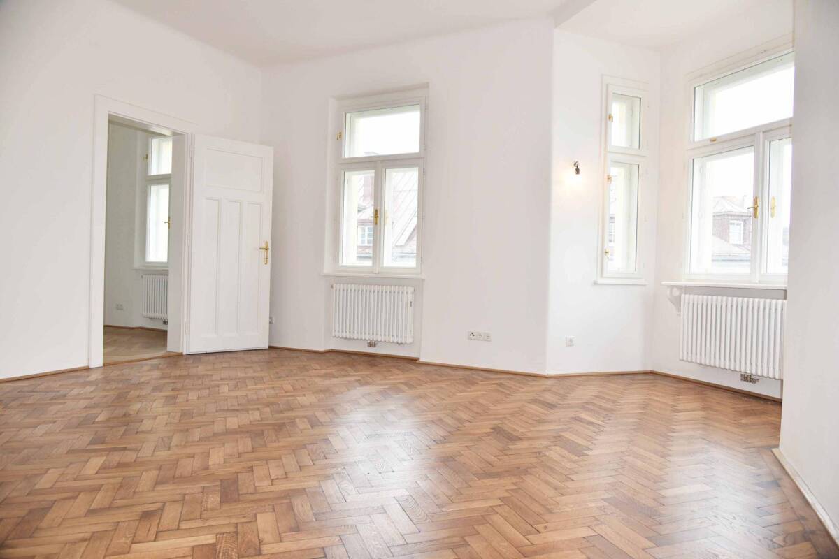 Betritt man die Wohnung kommt man in einen Vorraum von dem man geradeaus in den großen Wohnraum kommt. Hier gibt es den wunderbaren Fenstererker. Im Anschluss gelangt man in die Küche, die auch Platz für einen kleinen Tisch hat. Die Küche ist neu und neutral in weiß gehalten. Es gibt einen Geschirrspüler, Kühlschrank, Herd mit Backrohr und Ober- und Unterschränke. Vom Wohnzimmer links liebt das Schlafzimmer mit großem Fennster und gegenüber ist das geräumige Bad mit Badewanne und Waschmaschinenanschluss. Besonders hervorheben kann man die wunderbaren Raumhöhen und die sehr schönen Parkettböden.