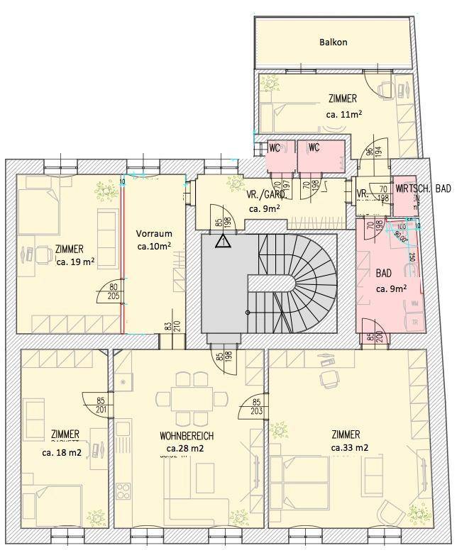 Die Wohnung hat • 4 getrennt begehbare Zimmer tlw. mit Parkettböden ausgestattet. • einen großen zentralen Wohnraum, wo die Anschlüsse für eine Küche vorhanden sind • 2 getrennte WC's • ein Bad mit Dusche, Waschbecken und Anschlüsse für Waschmaschine und Wäschetrockner • einen kleinen Waschraum mit Waschbecken • Balkon mit ca. 10 m2 Die Heizung erfolgt über eine zentrale Gasetagenheizung