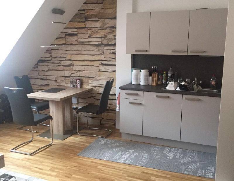 Die Dachgeschosswohnung besteht aus einem Schlafzimmer, Wohn-/Esszimmer mit neuwertiger Einbauküche, einem großen Vorraum und Badzimmer mit Dusche, WC und Waschmaschinenanschluß. Ein Garten mit Grillmöglichkeit steht im Innenhof zur allgemeinen Verfügung. Ebenso ist der Wohnung ein PKW-Stellplatz zugeordnet. Eine Fahrradabstellmöglichkeit im Freien ist vorhanden. Ein Gemeinschaftskeller steht der Allgemeinheit zur Verfügung (Kellermitbenutzung).