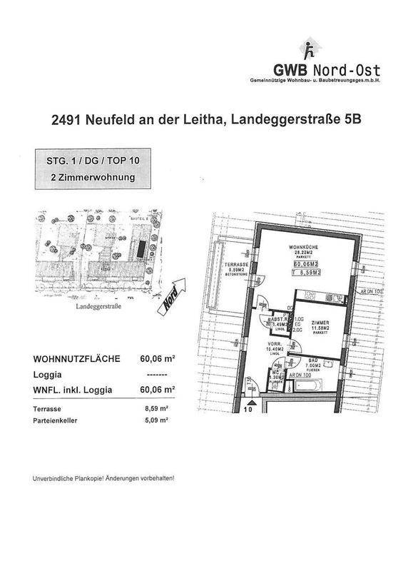 Schöne helle 2 - Zimmer Wohnung in Neufeld an der Leitha Kosten: Finanzierungsbeitrag: € 20.562,75 Monatliche Kosten: € 528,80 (Inkl. USt. und Betriebskosten) Kaufoption: JA Zur WIEDERVERMIETUNG gelangt eine 60,06 m² große 2 - ZIMMER WOHNUNG mit Loggia im DG eines NEUBAU-KOMPLEXES errichtet im Baujahr 2004. Das Highlight der Wohnung ist der helle Wohnbereich mit direktem Zugang zu einer schönen Terrasse. Alle Räume sind zentral begehbar. HIGHLIGHTS: Barrierefreier Zugang durch einen Lift Loggia Ruhelage RAUMAUFTEILUNG: Vorraum WC Bad Zimmer Abstellraum Wohnküche Loggia Bitte melden Sie sich bei Interesse per E-Mail an: wohnungssuche@familienwohnbau.at Sie werden von uns für einen Besichtigungstermin kontaktiert! Danke! Bezug: 01.02.2021Energiedaten: Energieausweis: liegt vor HWB: 42,39