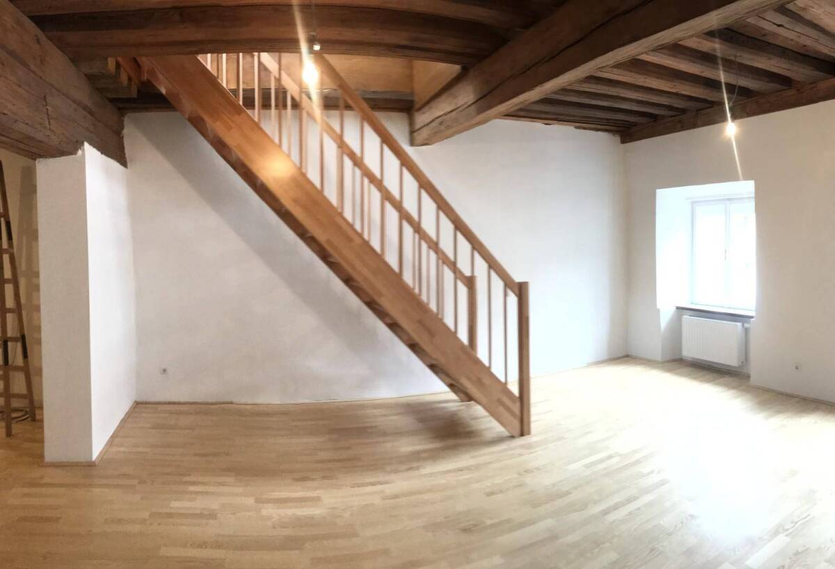 Das Haus:Ein Juwel mitten in der Altstadt Halleins, erbaut in den Jahren um 1540, steht das denkmalgeschützte Haus am Florianiplatz. Im Gebäude finden sich im Erdgeschoss ein Geschäftslokal, sowie zwei im Maisonette-Stil errichtete Wohneinheiten vom Obergeschoß ins Dachgeschoß führend.Unter Berücksichtigung auf die geschichtsträchtige Substanz des Hauses, hat der Eigentümer die beiden oberen Stockwerke komplett saniert und im September diesen Jahres fertiggestellt.Über das allgemeine Stiegenhaus führt eine breite Stiege in das Erste Obergeschoss des Hauses. Von hier gelangen Sie jeweils zu den Wohnung Top 3 und Top 4.In den Wohnräumen trifft sich eine Kombination aus alt und modern - das Ergebniss ist besonders gelungen. Mit viel Liebe zum Detail wurden u.a. die tragenden Elemente an der Decke aus Holz in ihrem Ursprung belassen, sandgestrahlt und so als Highligt in den Wohnraum integriert.Die Wohnung Top 4:Mit ca. 107 m² Wohnfläche besteht die Wohnung Top 4 im 1. OG aus Vorraum, Abstellraum mit Waschmaschineanschluss und eigener elektr. Lüftung, Küche- und Wohnraum, sowie 1 Gäste-WC. Über eine offene Holzstiege gelangen sie weiter ins Dachgeschoß zum Schlafzimmer. Badezimmer mit Dusche und Badewanne, sowie eine separates WC sind hier angelegt. Auch ein zusätzlicher, kleiner Abstellraum findet Platz unterm Dach.Alle Wohn- und Schlafräume wurden mit Fenstern ausgestattet, die im Dachgeschoß eingebauten Dachflächenfenster bieten eine helle und freundliche Atmosphäre. Auch in den Nassräumen wie Badezimmer und WC ist so eine natürliche Belüftung garantiert.Aus Rücksicht auf die unterschiedlichen Bedürfnisse und Geschmäcker eines potentiellen Mieters, wurde der gesamte Wohnraum neutral ausgestattet. Fliesen und Parkettböden stimmen sich mit dem altertümlichen Türen und der Decke aus Altholz passend ab. Der Grundriss lässt viel Gestaltungsfreiraum, eine Küche ist vom zukünftigen Mieter selbst einzubauen.Beheizt werden die Räumlichkeiten mittels Fernwärme, Bezug von TV + Internet Anschluss ist mittels SAG Salzburg möglich. Abrechnung erfolgt über den jeweiligen Anbieter mit dem Mieter direkt und richtet sich nach dem Verbrauch der Bewohner.in perfekter Wohntraum für Pärchen mit Vorliebe zu zentralem Wohnen!Geschäfte, Ärzte, Apotheken, Restaurants, Cafés und Bars befinden sich in unmittelbarer Nähe. Unter anderem stehen genügend Parkmöglichkeiten in der Kurzparkzone in unmittelbarer Nähe des Hauses zur Verfügung, öffentliche Parkhäuser und Parkplätze sind in wenigen Gehminuten zu erreichen.Infoplattformen zum Parksystem in und um Halleinhttps://www.hallein.gv.at/Parken_in_Hallein http://halleiner-parkgaragen.at/Der Bahnhof Hallein liegt fußläufig in ca.10 Minuten vom Wohnhaus entfernt. Der direkte Anschluss an das Netz der öffentlichen Verkehrsmittel wie Bahn und Bus sind somit vor der Haustüre gegeben.Fakten:• Miete gesamt € 986,00 (Miete: € 829,40,-- inkl. Ust., zzgl. Betriebskosten € 156,60, inkl. Ust. (zzgl. Heizung über Fernwärme, Strom, TV, Internet)) • Komplett neu saniert - Fertigstellung September 2020 • Erstbezug • 2-Zimmer-Maisonette Wohnung • großzügiger Grundriss, freundlich und hell • Bad mit Dusche und Badewanne, 2 WC extra • Waschmaschinenanschluss im Abstellraum mit eigener, elektr. Lüftung • Kabel und Internet SAG Salzburg • FernwärmeLangfristiges Mietverhältnis gewünscht - kein Eigenbedarf !Infrastruktur / EntfernungenGesundheit Arzt <500m Apotheke <500m Krankenhaus <1.500m Klinik <2.500m Kinder & Schulen Schule <500m Kindergarten <500m Universität <5.000m Höhere Schule <5.000m Nahversorgung Supermarkt <500m Bäckerei <500m Sonstige Bank <500m Geldautomat <500m Post <500m Polizei <500m Verkehr Bus <500m Bahnhof <1.000m Autobahnanschluss <2.000m Angaben Entfernung Luftlinie / Quelle: OpenStreetMap