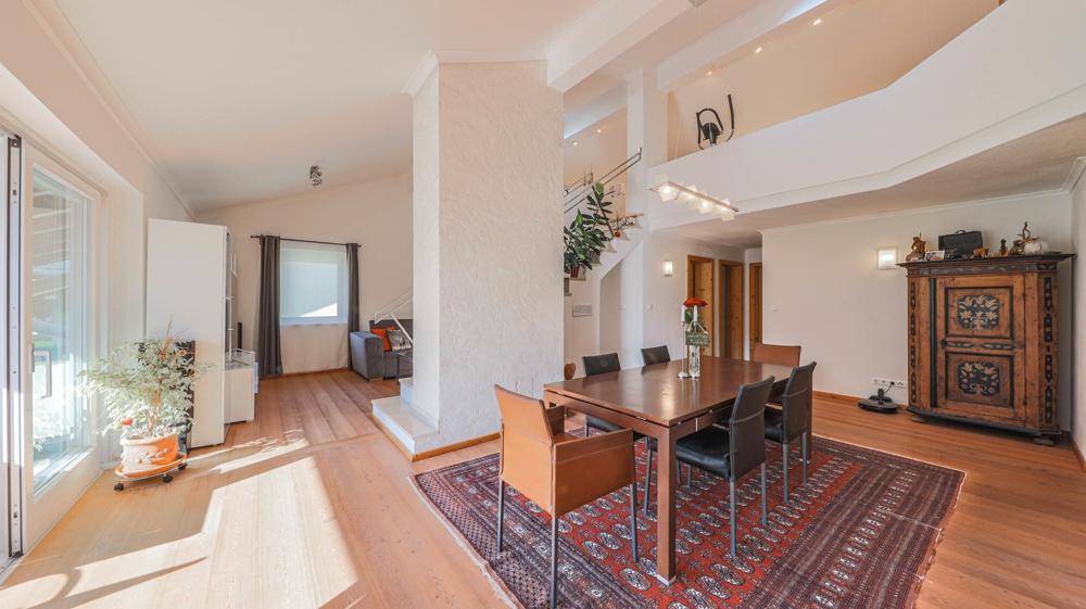 Diese besonders elegante Dachgeschosswohnung mit ca. 125 m² Wohnnutzfläche liegt in einer kleinen Wohnanlage und bietet einen weitläufigen Blick auf die umliegende Bergwelt, Weiden und Wiesen. Da die Wohnung auf der Sonnseite von Kirchberg liegt, können Sie hier den ganzen Tag die Sonne genießen. Die Wohnung besteht aus dem Eingangsbereich mit Garderobe, dem großzügigen Essbereich, wo auch eine große Tafel für 6 bis mehr Personen Platz findet sowie der offenen und voll ausgestatteten Küche mit kleiner Bar und Speis. Der gemütliche nach oben offene Wohnbereich ist räumlich optimal durch einen schlanken Kamin vom Essbereich getrennt und der Glaskamin ist architektonisch in die Freitreppe zur Galerie integriert. Weiters befindet sich auf dieser Etage das Masterschlafzimmer, ein Kinderzimmer und ein großzügiges Badezimmer mit Badewanne/Whirlpool und Doppel-Dampf-Duschkabine. Ein separates Gäste-WC steht ebenfalls zur Verfügung. Hier wurde auch die Waschmaschine bestens untergebracht. Die süd-westseitig gelegene ca. 9 m² große Balkon-Terrasse bietet einen weitläufigen, unverbaubaren Ausblick auf die umliegende Bergwelt und ist komplett überdacht. Hier befindet sich auch ein äußerst praktischer Stauraum mit etwa 8 m². Über die Treppe im Wohnbereich gelangt man auf die ca. 25 m² große Galerie der Wohnung, wo noch äußerst großzügige Stauräume in der Dachschräge vorhanden sind. Die Galerie bietet eine vielseitige Nutzung, so könnte man hier problemlos ein drittes Schlafzimmer einbauen. Derzeit wird sie als Büro genutzt. Weiters gehört noch ein kleiner Garten (ca. 44 m²), ein Kellerabteil (7 m²) sowie zwei Tiefgaragenstellplätze zum Objekt. Eine äußerst interessante Wohnung zu einem angemessenen Kaufpreis. Sofort verfügbar. Energiedaten in Arbeit.