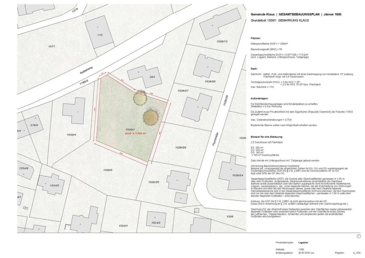 In der Gemeinde Klaus ist ein Grundstück 1530/1 Gemarkung Klaus zu veräußern. Ein Architekturbüro hat mit dem Bauamt in der Gemeinde das Baurecht ermittelt. Nettogrundfläche (NGF): 1298 qm Baunutzungszahl (BNZ) = 55 Gesamtgeschoßfläche (GGF) = 713,9 m3 Dachform: Sattel-, Pult-, und Walmdächer mit einer Dachneigung von mindestens 15 Grad zulässig. Flachdach möglich mit 2,5 Geschossen. Beispiel für eine Bebauung: 2,5 Geschosse mit Flachdach EG: 280 qm, OG: 280 qm, DG: 140 qm = 700 qm Geschossfläche Dazu könnte ein Untergeschoss incl. Tiefgarage gebaut werden.