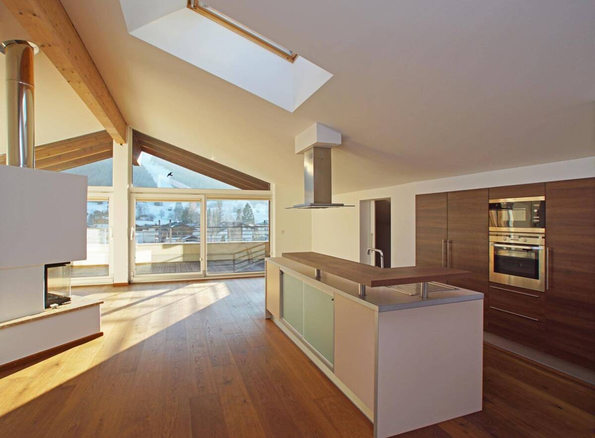 Diese 149 m² große Dachgeschosswohnung befindet sich in sonniger Lage im Herzen von Brixen. Der Skibus, diverse Einkaufsmöglichkeiten sowie mehrere Restaurants befinden sich in unmittelbarer Nähe. Die Wohnung gliedert sich in einen großen Wohn-/Essbereich mit offener Küche samt Kochinsel, zwei Schlafzimmer, ein Badezimmer, ein separates Gäste-WC sowie zwei Speicher. Im Wohnbereich befindet sich ein offener Kamin, welcher zentral positioniert wurde. Im direkten Anschluss befindet sich die 26 m² große nach Süden ausgerichtete Terrasse von wo man vom Gaisberg über die Choralpe bis nach Westendorf sehen kann. Das Badezimmer ist mit einer Dusche, Wanne, Doppelwaschbecken, Bidet, WC sowie Waschmaschinenanschluss ausgestattet. Im separaten Gäste-WC befindet sich ebenfalls ein Pissoir. Abgerundet wird diese Immobilie durch den ca 6 m² großes Kellerabteil und ein zugeordneter Tiefgaragenstellplatz. Short Cuts: Wohn-/Nutzfläche 148,93 m², Schlafzimmer 2, Badezimmer 1, offene Küche, sonnige Lage, Bergblick, Personenaufzug, süd-/westlich ausgerichteter Balkon, Fußbodenheizung, zentral, ein Tiefgaragenstellplatz, Kaufpreis € 1.050.000,-, HWB 41,3 fGEE 1,15 Es gelten unsere Allgemeinen Geschäftsbedingungen.