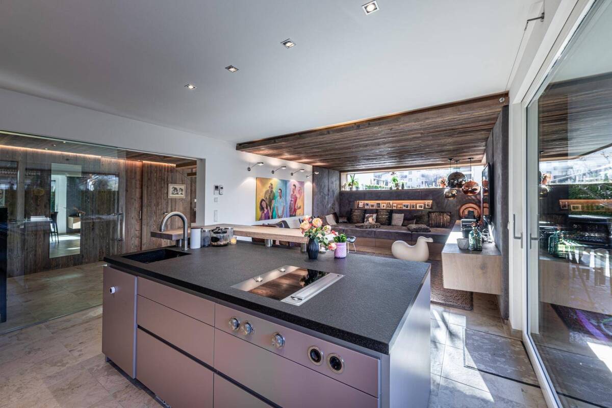 Dieses trendige Einfamilienhaus wurde planerisch äußerst geschickt konzipiert und beeindruckt neben der sehr hochwertigen Bauqualität mit edlem, modern-alpinem Interieur Design sowie äußerst hochwertiger Vollholz-Möblierung in Eiche und Altholz. Dem Eigentümer war ein besonders großzügiges Wohnraumkonzept sehr wichtig, das genügend Raum und private Rückzugsorte für Familie und Gäste bietet. Allein das Erdgeschoss mit einladendem Entrée mit begehbarer Garderobe, einem offenen Wohn-, Koch- und Essbereich mit Bulthaup Küche, Gaggenau Geräten, eigener Vorbereitungsküche sowie einer edlen Gästesuite mit Bad und eigenem Eingang, demonstriert inspirierenden Freiraum der Extraklasse. Abgerundet wird dieser Wohnkomfort durch den direkten Zugang zur Terrasse und in den nicht einsehbaren Garten, der neben absoluter Privatsphäre mit einem wundervollen Ausblick in die umliegende Bergwelt begeistert. Über eine elegante, freischwebende Treppe gelangen Sie ins Obergeschoss, welches neben dem Masterbereich mit Ankleide, auch mit einem eigenen Spa-Bereich mit Sauna, Infrarot, Dusche und Ruheraum überzeugt. Komplettiert wird diese Ebene durch die Panorama-Galerie mit Sky-Window, das dritte Gästezimmer mit Bad en suite sowie einen geräumigen Wirtschaftsraum der auch als viertes Schlafzimmer umfunktioniert werden könnte. Auch hinsichtlich technischer Details wurde sehr viel Wert auf höchste Qualität gelegt. Elektrische Raffstores, eine Erdwärme-Heizung mit Grundwasser-Wärmepumpe und Free Cooling, sowie Kabel- und Internetanschluss sind hier selbstverständlich. Für die Unterbringung Ihrer Fahrzeuge stehen in die geräumige Doppelgarage sowie drei Stellplätze im Freien zur Verfügung. Auch ein separater Fahrrad bzw. Skiraum bietet zusätzlichen Platz und Stauraum.