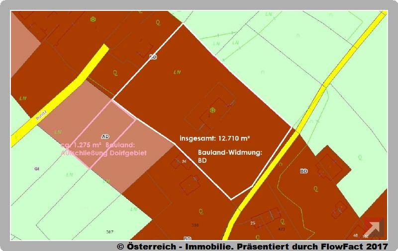 Investitionsobjekt bei Güssing: 16.000 m² Bauland - 1870 +18 ha. Wald + 2 ha landw. Fläche Eckdaten Objektart:Anlage-/Investmentobjekt Kategorie:Projekte für Bauträger u. Investoren 16.000 m² Baugrund, + landwirtschaftlicher Grund + Wald Grundstücksfläche: insgesamt: ca. 213.700 m² in/bei:Güssing Region:Burgenland Der Baugrund des großen Anwesens liegt innerhalb einer kleinen, absolut ruhigen Villen-Ortschaft im Umfeld von Güssing. Investitionsmöglichkeiten: Projekt für Bauträger und Investoren: Mehrfamilien-Haus Baugrund für Einfamilienhaus / - häuser Appartementhaus für Eigentumswohnunge) Baugrund für 2- u. Mehrfamalien-Häuser Der Wald verteilt sich auf mehrere zusammenhängende Flächen, die größte hat ca. 12 ha, die kleineren zwischen 1 und 3 ha.. Der Wald wird meist forstwirtschaftlich geschlägert , aber teilweise in größeren Abständen. Übernahmetermin:sofort Qualität (Lage):sehr gut Qualität (Umfeld):sehr gut Qualität (Ruhe):sehr gut Grundfläche in ha:ca. 21,4 Seehöhe:ca. 260 m Das vorhandene Landhaus: Das bestehende Landhaus - gebaut um 1900 - hat wahrscheinlich eine gute Bausubstanz, müsste aber wohl volständig entkernt und neu ausgebaut werden. Möblierung inkl.:vorhandene Möblierung ist im Preis inkludiert; wie weit das die Antiquitäten und sonstigen Wertgegenstände betrifft, ist nicht vereinbart. Zustand u.E.ungepflegt Bau-Grundstückja Erschliessungszustand: erschlossen Das Landhaus ist mit dem Frischwasser an eine eigene Quelle angeschlossen, verfügt aber auch über einen Anschluss an die Ortswasserleitung, ebenso an den öffentlichen Strom- und Kanalanschluss. Baujahr: ca. 1905 Gebäude-Nutzfläche: ca. 450 m² Wohnfläche ca. ca. 265 m² Zimmer/Räume: 9 Garagenanzahl: 1 Heizung u.: Ofenheizung Energieeffizienzklasse:2.35 Energiekennwert: 237.6 Energieausweis liegt vor:ja Qualität (Zustand): ungenügend Kaufpreis:€ 535.000,00 + Nebenkosten