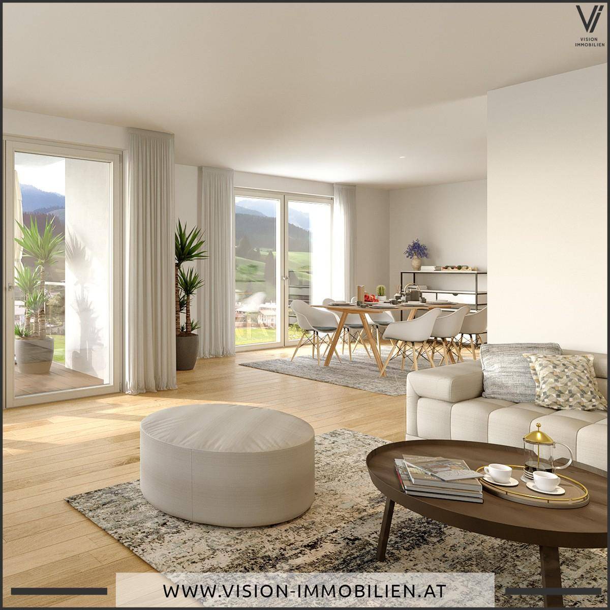 Zwischen den Alpen am Achensee wird hier eine moderne Eigentumswohnung angeboten. Der unverbaubare traumhafte Ausblick auf die Berge und auf Achenkirch geben dieser Immobilie eine extra Note. Die zeitmäßige Architektur sowie das gelungene Zusammenspiel modernster Materialien und klassischer Baustoffe, bietet Ihnen mehr als nur ein neues Zuhause an. Durch Einsatz von Modernster Technik, bietet das Objekt Ihnen ein komplett neues Wohnerlebnis, was intelligentes Wohnen anbelangt. Die Wohnung wird mit Alexa ausgestattet und wird über Smart Home Features verfügen. Die Fertigstellung dieses Objektes wurde mit Mitte 2021 geschätzt. Alle Wohnungen, wie auch das Kellergeschoss, können über einen Aufzug erreicht werden. Raumaufteilung: • Diele: 12,90m² • Wohnküche mit Essbereich: 38,61m² • Schlafzimmer: 14.24m² • Zimmer2: 12,94m² • Zimmer3: 10,31m² • Bad/WC: 7,06m² • WC: 2,70m² • Balkon: 19,71m² • 1 Stellplatz mit E-Ladestation Der Kaufpreis eines Tiefgaragenplatzes beträgt € 25.000,00. Da dieser Neubau am Anfang der Bauphase steht, bieten wir Ihnen an die Wohnung mit einer VR Virtual Reality Brille zu besichtigen. Videolink: https://www.vision-immobilien.at/projektentwicklung/