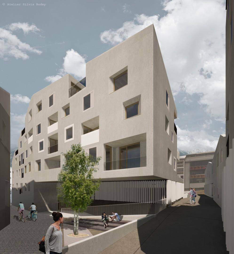 Quartier am RaiffeisenplatzMitten im Stadtkern von Schwaz entsteht ein neues Wohn- und Geschäftsquartier. Durch eine qualitätsvolle Verdichtung und natürliche Überwindung von Niveauunterschieden setzen vier Baukörper die Typologie der Innenstadt mit ihrer gassenartigen Durchwegung fort.Von der Innsbruckerstraße kommend dient die Raiffeisenpassage fußläufig als geschützter Zugang zu einem großzügigen Innenhof. Von hier aus kann sowohl die 2-geschoßige Tiefgarage, die Sockelzone als auch das interne Stiegenhaus betreten werden. Mit dem Auto wird die Tiefgarage über eine Rampe von Norden kommend (Postgasse) oder von Süden (Ullreichstraße) erreicht. Das erste Tiefgeschoss öffnet sich nach Osten Richtung Innenhof und bekommt somit Erdgeschoß-Charakter.Im Sockelbereich entstehen Geschäfts- bzw. Gewerbeflächen; Arbeiten und Wohnen im Zentrum verbinden sich.Der bestehende Baukörper mit Abschluss an der Innsbruckerstraße wird vertikal und horizontal erweitert. Ein zum Innenhof hin geneigtes Satteldach wird durch offene Terrassen mit Blick zum Schloss Freundsberg und zum Franziskanerkloster unterbrochen. Die Wohnungen im Neubau erhalten großzügige Terrassen bzw. geschützte Loggien. Sie werden über ein zentrales Treppenhaus mit Lift barrierefrei erschlossen.Im Innen- und Außenbereich wird Wert auf qualitätsvolle Architektur gelegt. Die Materialität soll im Austausch mit der Umgebung und der Geschichte von Schwaz stehen. Die oberen Geschoße werden ökologisch wertvoll in einer Mischbauweise zwischen Stahlbeton und Holzbauweise errichtet.Wohn(t)raum mit StilDie 2- bis 4-Zimmer-Wohnungen überzeugen durch ihre offene und klare Grundrissgestaltung. Zudem ist die Möglichkeit zur individuellen Planung Ihrer Wunschwohnung, zum derzeitigen Zeitpunkt, noch teilweise gegeben. Gemeinsam mit Ihnen entwickeln wir in der frühen Planungsphase Ihren individuellen Wohntraum in der Stadt Schwaz.Jede Wohnung verfügt weiters über ein eigenes Kellerabteil sowie einen Autoabstellplatz in der Tiefgarage. Dieser ist im angegebenen Kaufpreis nicht inkludiert und kann für 80€ netto monatlich angemietet werden.Finanzierung nach Ratenplan B für Eigennutzer:Rate: Zahlung nach Baufortschritt Zahlung:1. Rate binnen 14 Tagen ab Vertragsunterzeichnung 10%2. Rate nach Fertigstellung Rohbau und Dach 30%3. Rate nach Fertigstellung der Rohinstallationen 20%4. Rate nach Fertigstellung der Fassade u. Fenster 12%5. Rate nach Bezugsfertigstellung der Wohneinheit 17%6. Rate nach Fertigstellung der Gesamtanlage 9%7. Rate nach Erhalt einer Bankgarantie i.d.H von 2% 2%Die Anlage wird ohne Wohnbauförderung errichtet!Echtholzparkett im WohnbereichIn den Aufenthaltsräumen kommen ausschließlich edle Echtholzparkettböden in hochwirksamer Kombination mit Fußbodenheizung zum Einsatz; es steht eine Vielzahl an Ausführungen zur Wahl.Pflegeleichtes Feinsteinzeug in Sanitär- und NebenräumenGroßformatiges Feinsteinzeug veredelt Bad- und WC-Räume sowie Nebenräume. Die Vielfalt der ausgewählten Produkte ermöglicht eine große Bandbreite an individuellen Kombinationsmöglichkeiten:Bitte beachten Sie:Wir weisen darauf hin, dass zwischen dem Vermittler und dem Auftraggeber ein wirtschaftliches Naheverhältnis besteht. Der Vermittler ist als Doppelmakler tätig.Infrastruktur / EntfernungenGesundheit Arzt <500m Apotheke <500m Krankenhaus <500m Kinder & Schulen Schule <500m Kindergarten <500m Nahversorgung Supermarkt <500m Bäckerei <500m Einkaufszentrum <500m Sonstige Bank <500m Geldautomat <500m Post <500m Polizei <500m Verkehr Bus <500m Bahnhof <1.000m Autobahnanschluss <1.500m Angaben Entfernung Luftlinie / Quelle: OpenStreetMap