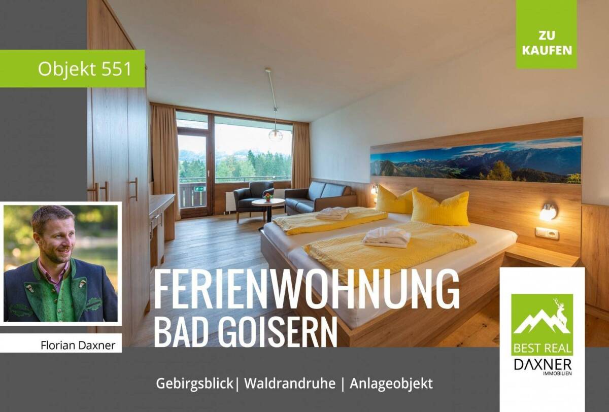 Eingebettet in die wunderschöne Bergwelt des Inneren Salzkammergutes, in exponierter, sonniger Waldrandruhelage befindet sich die gegenständliche Ferienwohnung, welche im Erdgeschoß einer gediegenen Wohn- bzw. Hotelanlage liegt.Die Wohnung im Ausmaß von rund 35m2 besteht aus einem Wohn/Schlafraum mit Ausgang zur Loggia, von welchem man einen traumhaften Fern- und Gebirgsblick genießen kann, sowie einem Badezimmer mit Wanne und WC. Genießen Sie hier die absolute Ruhelage! Die Wohnung ist barrierefrei erreichbar und wird komplett möbliert, zur sofortigen Nutzung übergeben.Die landschaftliche Vielfalt mit imposanten Gebirgszügen und insgesamt 76 glasklaren Seen, lässt im Sommer, wie im Winter Urlauberherzen höherschlagen. Dies wusste bereits Kaiser Franz Josef zu schätzen und verbrachte deshalb nahezu jede freie Minute im Inneren Salzkammergut, in einer der schönsten Regionen Österreichs. Nicht nur landschaftlich, sondern auch kulturell und traditionell hat das Salzkammergut einiges zu bieten. Berg- und Wassersportler, Kulturinteressierte aber auch Ruhesuchende kommen hier voll auf Ihre Kosten.Die Kulturhauptstadt Bad Ischl sowie der allseits bekannte Weltkulturerbeort Hallstatt sind nur wenige Autominuten von der Liegenschaft entfernt und mitunter äußerst beliebte Ausflugsziele.Der laufende Hotelbetrieb bietet Ihnen oder Ihren Gästen obendrein die Möglichkeit täglich (gegen Bezahlung) am reichhaltigen Frühstücksbuffet oder im à la carte Restaurant teilzuhaben. Der sehr gepflegte Wellnessbereich bietet Entspannung für alle Sinne!Mit einer möglichen Nettorendite von rund 5% ist die Wohnung nicht nur für Urlauber, sondern auch für Anleger eine tolle Alternative in einer der schönsten, naturnahen Regionen zu investieren. Während Ihrer Abwesenheit besteht auch die Möglichkeit die Wohnung direkt an das Hotel zu vermieten. Somit bietet diese Immobilie eine interessante Kombination aus Eigennutzung und Anlegerobjekt. Hier entscheiden Sie selbst, ob Sie es sich gute gehen lassen oder Ihr investiertes Geld für Sie arbeiten lassen.Erfahren Sie mehr in einem persönlichen Gespräch - wir freuen uns auf Sie!!