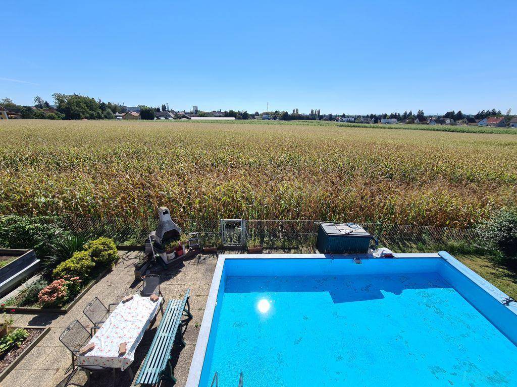 Großzügige Hausetage im 1 OG. eines gepflegten Zweifamilienwohnhauses. Die Wohnung besteht aus den abgeschlossenen Stiegenaufgang, VR, Bad mit Dusche/Wanne und Fenster, WC mit Fenster, Wohnraum mit Balkon und Schwedenofen, Esszimmer mit Balkon mit unverbaubaren Grünblick, große Küche, 2 Schlafzimmern, Kellerraum von außen zugänglich, Garage und Parkplatz im Freien, Mitbenutzen des schönen großen Gartens, des Pools und der Gartenbeete. Geeignet für eine kleine Familie oder ein Pärchen. Kleintierhaltung z.b. Katze möglich. Gesamtmiete 1.000 € inkl. BK/HK/Wasser. Ruhige sonnige Lage, sehr gute Infrastruktur (vieles ist fußläufig in Kürze erreichbar).