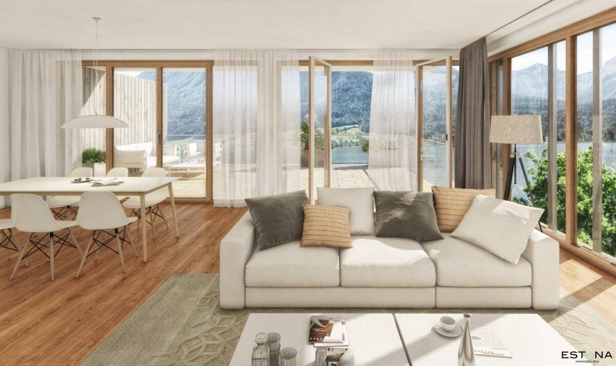 In rarer und hochbegehrter Lage, nur ein paar Minuten fußläufig vom Ortszentrum St. Wolfgang entfernt, entsteht mit „Wolfgang am See“ ein außergewöhnliches Projekt mit eigenem Badesteg in einer der letzten bebaubaren Seeliegenschaften.Die sensationelle Lage am Südhang direkt am See, die ansprechende Architektur und die hochwertige Ausstattung laden dazu ein, die Seeresidenzen das ganze Jahr zu genießen. Entdecken Sie ein besonderes Wohngefühl, geprägt durch helle, natürliche Materialien und einen exklusiven Ausblick auf die umgebende Landschaft und den Wolfgangsee.Von der großzügigen 2-Zimmer Wohnung genießen Sie über den Balkon den herrlichen Ausblick seitlich auf den See und die Berge. Die süd-ost-seitige Ausrichtung lässt die Wohnung bereits am Morgen angenehm hell erstrahlen.Raumaufteilung: • große und helle Wohnküche mit Zugang zum südöstlichen Balkon mit seitlichem Seeblick • geräumiges Schlafzimmer • En-Suite Badezimmer mit Badewanne, Walk In Dusche und Waschbecken • Abstellraum mit Waschmaschinenanschluss • separates WC mit WaschbeckenAusstattung: • motorbetriebene Raffstores an den Holz-Alu-Fenstern • Fußbodenheizung • hochwertige Bodenbeläge mit Admonter Holzdiele und Feinsteinzeug • SicherheitstürenSt. Wolfgang im Salzkammergut:Eingebettet in die wunderschöne Landschaft des Salzkammerguts liegt St. Wolfgang am Nordufer des Wolfgangsees und am Fuße des Schafberges. St. Wolfgang ist ein wunderbarer Ursprungsort, um die Region um den See zu erkunden und bietet vielfältige Möglichkeiten, um zu entspannen oder die Zeit aktiv zu verbringen. Im Sommer lädt der wärmste See im Salzkammergut bei fast durchgehend 24 Grad Wassertemperatur zum Schwimmen, Segeln, Surfen und Tauchen ein. Aber auch im Winter ist St. Wolfgang der perfekte Ausgangspunkt für Ihre Freizeitaktivitäten: Das schneesichere Gebiet rund um den Wolfgangsee bietet mehr als fünf Schigebiete, unter anderem den Krippenstein, den Feuerkogel, die Katrin, die Postalm und das größte Schigebiet Oberösterreichs - den Dachstein West.Unsere exklusive Seeresidenz „Wolfgang am See“ liegt etwas außerhalb des Zentrums direkt am Wolfgangsee, nur ein paar Schritte vom Ortskern mit Restaurants und netten Geschäften entfernt. Über die Seepromenade können Sie in wenigen Minuten direkt in den Ort flanieren. Auch Schiffstation, Schafbergbahn und "Überfuhr" (Shuttleboot für Passagiere und Fahrräder) zur anderen Seeseite sind zu Fuß gut erreichbar. Nur eine Autostunde von Salzburg und zwei Autostunden von München entfernt, ist St. Wolfgang auch optimal gelegen für einen spontanen Ausflug von der Großstadt oder in die Großstadt.Kaufpreis: Apartment: € 582.576,- Garagenstellplatz: € 25.000,- Maklerhonorar: € 20.972,74 inkl. 20% USt.Für weitere Fragen oder persönliche Besichtigungswünsche wenden Sie sich bitte an Frau Mag. Bettina Zaininger unter 0676 / 555 66 60 bzw. zaininger@estina.at