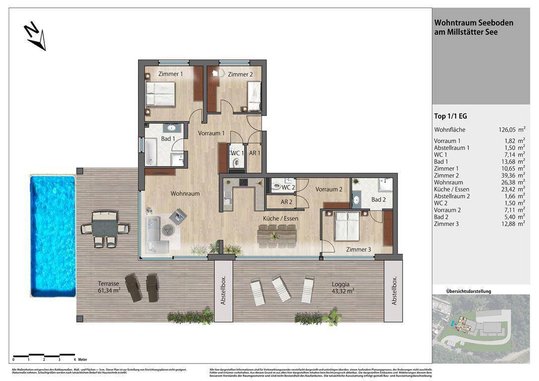 Panoramaaufnahme 360° vom Projektstandort sowie der Umgebung http://d38839.ispservices.at/KD-Ordner/Villa-M1/Wohntraum_am_See.html Wohnung Top 1/1: Diese Traumwohnung befindet sich im Erdgeschoss vom Haus 1 und verfügt über einen Vorraum, drei Schlafzimmer, 2 WC's, 2 Bäder, 2 Abstellräume sowie einen großzügigen Wohn- Essbereich. Der Wohnung vorgelagert befindet sich die perfekte Seeblickterrasse mit einem unverbaubaren Panoramablick auf den Millstättersee und seine umgebende Berglandschaft. An der Westseite der Wohnung direkt im Anschluss an die Terrasse befindet sich der vorbereitete Platz für Ihre exklusive Infinity Pool Anlage! Projekt: Das Wohnprojekt wird direkt am Südwestufer des Millstätter Sees in unmittelbarer Nähe zum Zentrum der Marktgemeinde Seeboden am Millstättersee errichtet. Die ca. 5.400 m² große Liegenschaft mit einer als Bauland gewidmeten Fläche von ca. 3.000 m² befindet sich auf einer über Jahrzehnte als Steinbruch genutzten und somit künstlich geschaffenen Fläche. Das zu bebauende Plateau liegt in leicht erhöhter Lage nur 30 Meter über dem See und nur einen Steinwurf (50 m) vom See entfernt. Die zwei nebeneinander in dreigeschossiger und zweigeschossiger, massiver Bauweise geplanten Gebäude fügen sich architektonisch perfekt und behutsam als Abschluss des intensiv bebauten Baulandes in die Natur ein. Die Liegenschaft grenzt an drei Seiten an forstwirtschaftlich gewidmete Flächen. Bekanntermaßen sind Wohnobjekte auf solch großartigen 1A Grundstücken in direkter Seelage sehr rar und stellen zur perfekten Wohnqualität auch eine optimale Zukunftsinvestition dar. Dieses Immobilienprojekt am wunderschönen Kärntner Badesee wird exklusiv für Sie errichtet! Wohnobjekte: Zum Verkauf stehen 13 Wohneinheiten mit Größen von 52 m², 74 m² sowie 102 m². Sämtliche Wohnungen verfügen über große Loggien, Terrassen und/oder Gärten mit einem unverbaubaren Ausblick auf den nur wenige Schritte entfernten Millstätter See. Die angebotenen Grundrisse sind hinsichtlich der Innenraumaufteilung sowie auch der Wohnfläche derzeit noch sehr flexibel gestaltbar. Wohnflächen bis zu 200 m² können ohne Probleme verwirklicht werden!