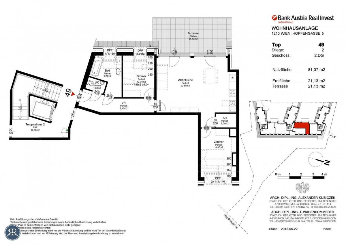 Moderne 3-Zimmer-Wohnung im 2. Dachgeschoss mit Terrasse, Küche, Bad + WCAlle Wohnungen entsprechen einem hochwertigen Standard und sind komplett ausgestattet mit:Küche (Herd mit Dunstabzugshaube, Spüle, Geschirrspüler, Kühlkombination), Bad, WC, Parkettboden, Dreh- und Kippfenster mit Wärmeschutz.Mietdauer: 5 Jahre plus 5 Jahre Verlängerungsoption Kaution: 3 Bruttomonatsmieten Garage: € 97,--/Monat (optional) Bezug: sofortDie neu gebaute, moderne Wohnanlage (Niedrigenergiehaus mit Gaszentralheizung) zeichnet sich v.a. durch ihre attraktive Gestaltung und Ruhelage aus. Die durchdachte Architektur mit Gärten, Balkonen und Loggias garantiert für alle Mieter ein angenehmes Wohnambiente. Selbstverständlich steht Ihnen eine hauseigene Tiefgarage mit direktem Liftzugang, Waschküche und Fahrradräumen zur Verfügung.Pläne aller Wohnungen und Etagen finden Sie unter www.hopfengasse5.at.Im Sinne des Maklergesetzes weisen wir darauf hin, dass ein wirtschaftliches Naheverhältnis mit dem Auftraggeber/Eigentümer besteht.Für weitere Informationen oder eine Besichtigung stehen wir Ihnen gerne zur Verfügung.Schicken Sie uns eine Anfrage bzw. kontaktieren uns persönlich unter 01- 40 22 888 - 0.Infrastruktur / EntfernungenGesundheit Arzt <700m Apotheke <300m Krankenhaus <1.125m Klinik <1.925m Kinder & Schulen Schule <425m Kindergarten <100m Universität <2.000m Höhere Schule <1.150m Nahversorgung Supermarkt <125m Bäckerei <350m Einkaufszentrum <575m Sonstige Bank <850m Geldautomat <850m Post <475m Polizei <1.000m Verkehr Bus <200m Straßenbahn <200m U-Bahn <1.600m Bahnhof <450m Autobahnanschluss <450m Angaben Entfernung Luftlinie / Quelle: OpenStreetMap