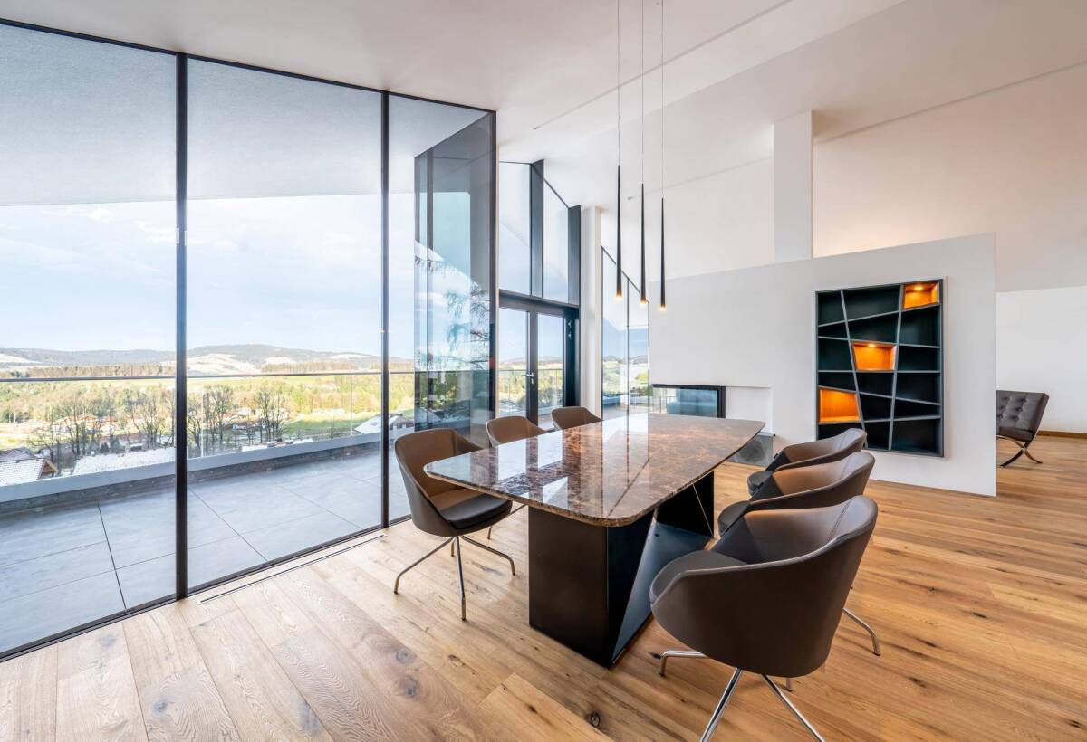Im Alleinauftrag vermitteln wir dieses neu gebaute Einfamilienhaus, welches in Baustil, Ausstattung, Qualität und Lage einzigartig in Hof bei Salzburg ist und über dem Dorf thront, mit einem atemberaubenden Blick bis in die Alpen Richtung Fuschl am See. Es wurde bewusst ein modernes Objekt erschaffen, das keine Wünsche offen lässt. Zu den Hauptmerkmalen gehören ein Wellnessbereich mit Indoorpool und Gegenstromanlage, Salzwasser, Wandheizung und Dampfsauna, ein Masterbedbereich mit Ankleidezimmer und Traventiner Marmorbad, eine Gästewohnung mit eigenem Eingang, Wohnbereich, Küche und Bad, ein moderner Kamin im Wohnbereich mit 13 Kw und ein Loxone Bussystem, welches die gesamte Haustechnik (Alarmanlage, Fußbodenheizung, Pool, Wohnraumbelüftung in allen Räumen) auch mittels Mobiltelefon steuern lässt. Die einzelnen Etagen sind bequem mit dem Etagenlift erreichbar. Das Haus ist komplett neu mit hochwertigen Möbeln ausgestattet. Weitere Ausstattungsmerkmale sind die 9 Kw Oxner Luft-Wärmepumpe, eine Solaranlage mit 5,4 Kw, eine Zisterne mit 4 Kubickmetern Fassungsvermögen, Hochdruckwasseranlage, Wasserentkalkungsanlage, Eichendielenböden, Glasfassade mit 3-Fach Verglasung, Marmorbäder und Gästetoiletten (Traventiner Marmor, Indischer Marmor, Griechischer Cavallamarmor), Garage, Stellplätze. Aussenbereich mit Jakuzzi, und Grillküche. BESICHTIGUNGEN Besichtigungstermine können gegen Vorlage eines Bonitätsnachweises kurzfristig vereinbart werden. TRIPLE-A PROPERTIES Finden Sie weitere Informationen zum Objekt unter: https://triple-a-properties.com