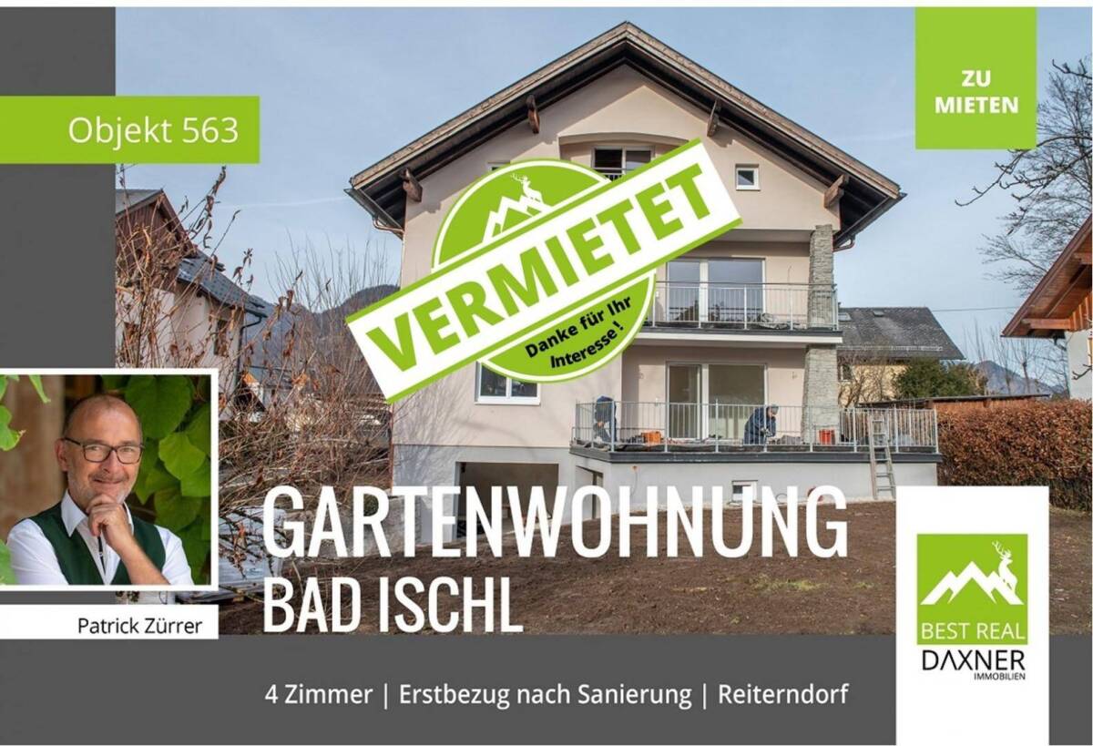 ERSTBEZUG nach Generalsanierung!Lichtdurchflutete 4-Zimmer Garten-Terrassen-Wohnung im Ortsteil Reiterndorf von Bad Ischl zu vermieten.Diese Wohnung liegt in einem 2-Parteienhaus und wurde in den vergangenen Monaten von Grund auf hochwertig generalsaniert. Ausgestattet mit einem hellen Bad mit begehbarer Dusche und einer modernen Küche.Geheizt wird über eine Zentralheizung mit Gas und Bodenheizung.Es stehen Ihnen drei Schlafzimmer, ein großes Wohnzimmer, Speis, Abstellraum, Kellerraum und ein Garagenstellplatz zur Verfügung. Von der Sonnenterrasse haben Sie Zugang zu Ihrem Garten. Ein idealer Ort für die ganze Familie.In wenigen Gehminuten sind Kindergarten, Volksschule, Gymnasium und ein Supermarkt erreichbar. Ins Stadtzentrum sind es ca. 15 Min. Fußweg.Bezugsbereit ist diese Wohnung ab sofort.