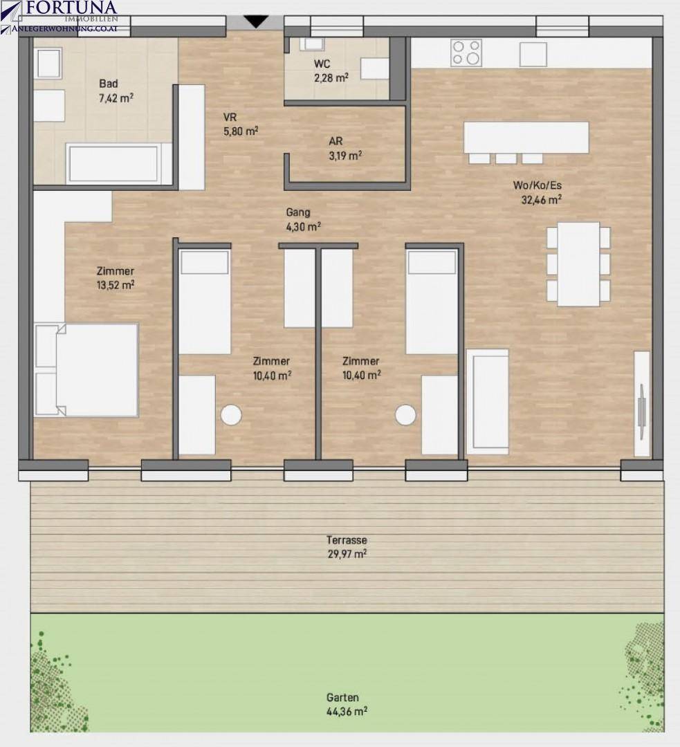 Absolute Ruhelage von St. Peter - ausgeführt in qualitativ hochwertiger Ausstattungs- u. Bauweise.Hier entstehen unterschiedliche Wohnkonzepte, die für jede Anforderung eine Lösung parat haben.Die Größen der Wohnungen liegen zwischen 44 m² -101 m² und die zugeordneten Freibereiche zwischen 8,2 m² - 181 m². Große Fensterflächen sorgen für viel Tageslicht im Innenraum, während großzügige Terrassen und Privatgärten den Lebensraum ins Freie erweitern.Wer das Besondere im Besonderen sucht, wird sich bestimmt in eine der Wohnungen verlieben. Alle Details fügen sich harmonisch ineinander, um das Leben so angenehm wie möglich zu machen.Hier finden sowohl Eigennutzer als auch Anleger eine ausgezeichnete und wertstabile Investitionsmöglichkeit mit langfristig hohem Ertragspotential.+++ Wenn Sie eine ausführliche Beratung zu diesem Projekt wünschen, lassen Sie uns bitte gleich eine schriftliche Anfrage, am besten mit Ihren Terminwünschen zukommen! (Wir melden uns verlässlich zurück) +++ Zur 4 Zimmer Wohnung - 89,77 m²:Wohn-/Essbereich (32,46 m²)Zimmer 1 (13,52 m²) Zimmer 2 (10,40 m²)Zimmer 3 (10,40 m²) Vorraum (5,80 m²)Gang (4,30 m²)Abstellraum (3,19 m²)separate Toilette (2,28 m²)Badezimmer (7,42 m²)Terrasse (29,97 m²)Eigengarten (44,36 m²) Besonderheiten:Wenn Sie Wert auf eine alltagstaugliche Grundrissplanung, hochwertige Ausstattung und perfekte Bauqualität legen, dann sind Sie hier goldrichtig. Abgerundet wird dieses attraktive Angebot durch die Terrasse mit Eigengarten.Ausstattung:Die Wohnung wird hochwertig und modern ausgestattet und schlüsselfertig (Küche gegen Aufpreis) übergeben.3-fach verglaste Kunststoff-Alu Fensteraußenliegender SonnenschutzParkettbödenHochwertiges FeinsteinzeugSprossenheizkörper im BadezimmerAußenbereich mit Sichtschutz und ZaunFußbodenheizung über FernwärmeBarrierefreiEine ausführliche Bau- u. Ausstattungsbeschreibung ist auf Wunsch verfügbar.Lage und Umgebung:Bereits bei der Planung wurde sehr viel Wert auf eine Wohnumgebung gelegt, die das Leben der zukünftigen Bewohner etwas entschleunigt. Ein Umfeld, das sofortige und vollkommene Harmonie ausstrahlt.Die Wohnungen liegen absolut ruhig, versetzt zur St. Peter Hauptstraße. Dennoch genießt man alle Annehmlichkeiten, die Graz zu bieten hat. Eine perfekte Anbindung an den öffentlichen Verkehr, garantiert komfortablen und schnellen Transfer in die Innenstadt. Wer des Öfteren aus Graz raus muss, erreicht mit dem Auto in nur wenigen Minuten die A2 bzw. A9.Der tägliche Bedarf lässt sich auch ohne Verkehrsmittel, ganz bequem zu Fuß erledigen. Eine Vielzahl an Geschäften, Cafés, Restaurants, etc. sind gleich um´s Eck!Preis:Der angegebene Kaufpreis versteht sich als Bruttopreis für Eigennutzer. Der Kaufpreis für Anleger beträgt 373.623,- EUR.Nutzen Sie die Möglichkeit zum kostenlosen Beratungsgespräch und informieren Sie sich über alle Details die Sie noch gerne wissen möchten!Für weitere Details steht Ihnen Frau Laura Böchzelt unter 0664/100 19 13, oder boechzelt@fortunaimmobilien.at, sehr gerne zur Verfügung.Ich freue mich von Ihnen zu hören! Infrastruktur / EntfernungenGesundheit Arzt <500m Apotheke <1.000m Klinik <3.000m Krankenhaus <4.000m Kinder & Schulen Schule <500m Kindergarten <1.000m Universität <2.000m Höhere Schule <3.500m Nahversorgung Supermarkt <500m Bäckerei <1.000m Einkaufszentrum <2.000m Sonstige Bank <1.000m Geldautomat <1.000m Post <1.000m Polizei <2.500m Verkehr Bus <500m Straßenbahn <1.000m Autobahnanschluss <2.000m Bahnhof <2.000m Flughafen <8.000m Angaben Entfernung Luftlinie / Quelle: OpenStreetMap