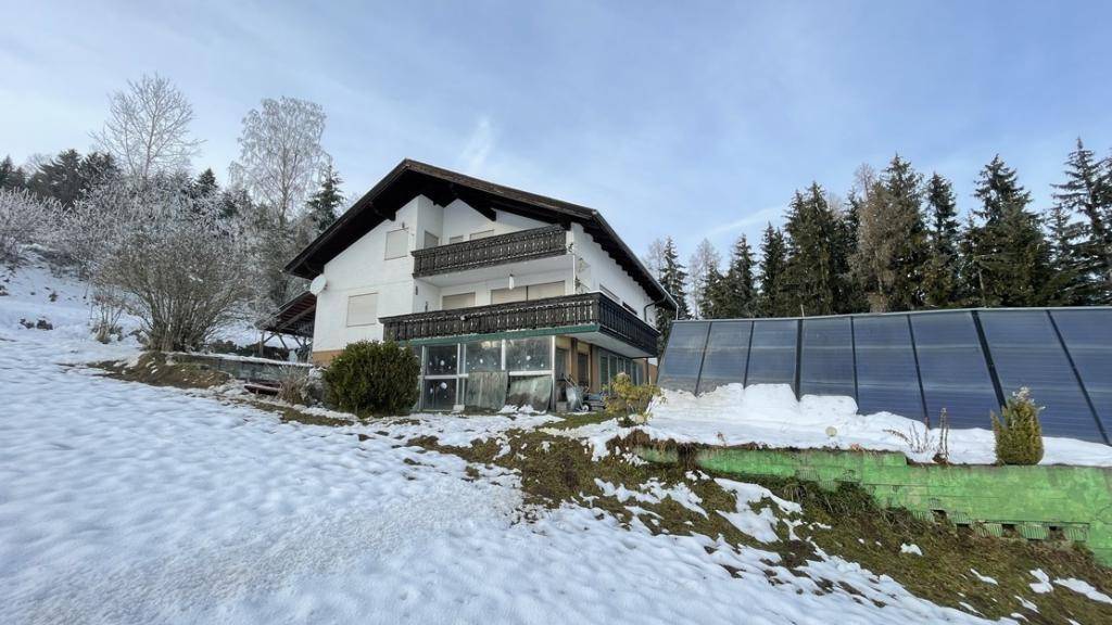 Wolfsbergnähe ruhige, sonnige Alleinlage: Traumblick über das Lavanttal, 2 bis 3 Fam. Wohnhaus 248 m² Wfl., mit Hallenbad 8 x 4,5 m, ÖL-Zentralheizung + Solar + Kaminofen in DG, über Wolfsberg in 900 m Seehöhe gelegen, in ruhige Sonnenlage, asphaltierte Zufahrt, 5 Garagen, über das Garagengebäude besteht die Möglichkeit ein Ferienhaus zu bauen, eigene Quelle, Biologische Kläranlage, 3.143 m² Grund, Dach im Jahr 1996 erneuert, Wolfsberg ca. 7 KM, HWB i.A., € 260.000,- • Erdgeschoss: Stiegenaufgang, Vorraum, Wohnesszimmer, große Sonnenterrasse mit Traumblick, Küche, Speis, 2 Schlafzimmer, Bad, WC, 2 Garagen • Untergeschoss: Stiegenabgang, Vorraum, Hallenbad 8 x 4,5 m, Sauna, Dusche-WC, Heiz,-Tankraum, Kellerraum, Büro. * Dachgeschoss: Stiegenaufgang, Garconniere und Wohnung 79 m² mit Kaminofen und großen Balkon.